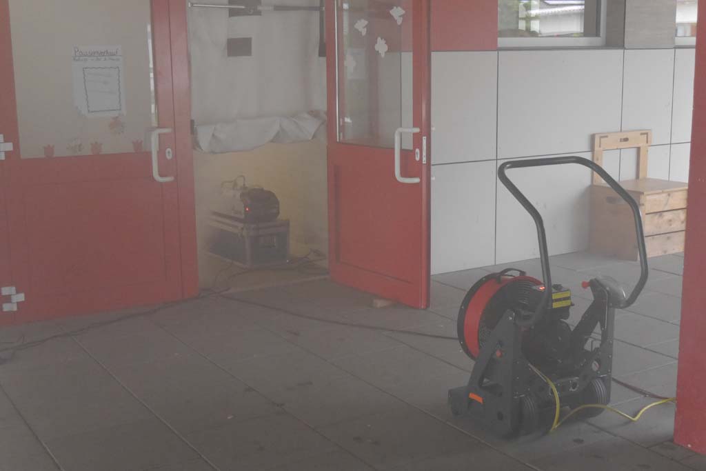 Danach wurden nochmals die Grundsätze für einen Einsatz des Lüfters besprochen. Es wurde festgelegt, wo die Abluftöffnung sein sollte und welche Größe sie hat. Der Standort des Lüfters wurde festgelegt und die Zuluftöffnung verkleinert. Ein Atemschutztrupp öffnete den Abluftöffnung und nachdem dieser das Gebäude wieder verlassen hatte, wurde der Lüfter in Betrieb genommen. Relativ schnell konnte man erkennen, dass der Rauch gut abzog. Beim Gang durch die Klassenzimmer konnte man nicht mehr erkennen, dass Rauch in die Räume gedrückt wurde. In relativ kurzer Zeit war das Treppenhaus Rauchfrei.