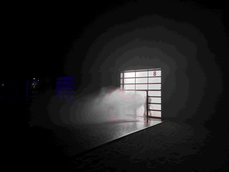 Im praktischen Teil wurde verdeutlicht, wie wichtig das Größenverhältnis zwischen Zu- und Abluftöffnung ist. Hierzu wurde eine unserer Hallen verraucht.