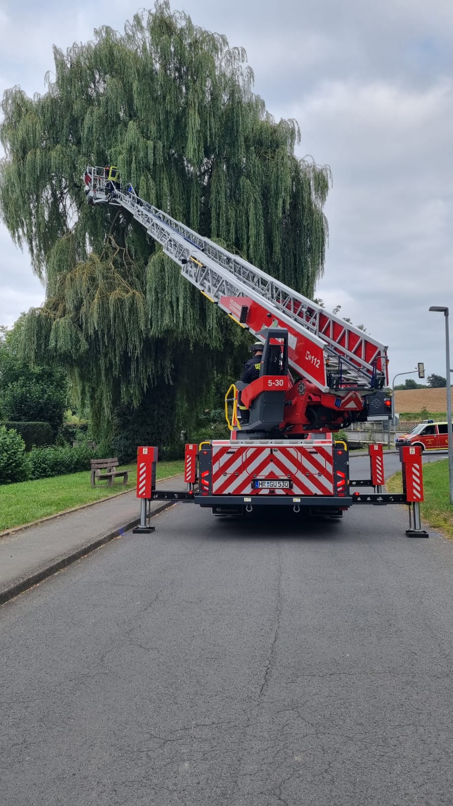 Ein angebrochener Ast drohte auf die Straße zu stürzen. Wir unterstützen die Feuerwehr Edermünde mit unserer Drehleiter und entfernten den Ast mittels Astsäge.