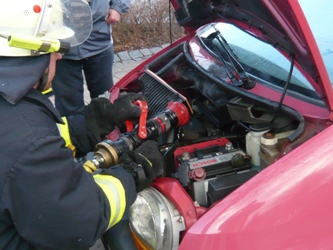 Beim Eintreffen der Einsatzkräfte war das Feuer aus und die Arbeit der Feuerwehr bestand darin, den Übergang vom Motorraum zum Fahrgastraum kurz mit Wasser abzukühlen und die Batterie abzuklemmen.