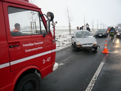 Die Besatzung des TSF der Feuerwehr Dorla, die sich auf der Rückfahrt der "Rahmenübung Unwetter" befand, kam kurze Zeit später an der Unfallstelle vorbei. Die Einsatzkräfte der Feuerwehr Dorla sicherten die Unfallstelle ab und forderten Verstärkung von der Feuerwehr Gudensberg nach. Diese rückten mit ELW 1 und HLF 16/12 aus.