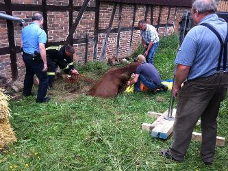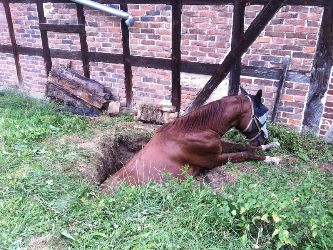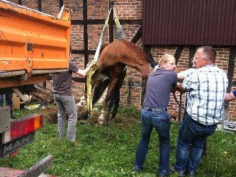 . Ein Pferd war auf einer Wiese in einer alten Güllegrube eingekracht. Die Grube war mit morschen Bohlen abgedeckt und wohl in Vergessenheit geraten. Die Stute war im 7 Monat trächtig. Das Pferd konnte sich allein nicht befreien.