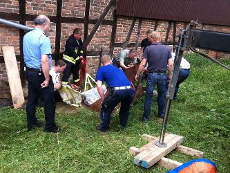 Die Einsatzkräfte sicherten die scharfkantigen Rohre in der Grube mit Bohlen damit sich das Tier keine weiteren Verletzungen zufügen konnte. Da das Pferd weiter einzusinken drohte, wurde es mit Lastbändern gesichert.