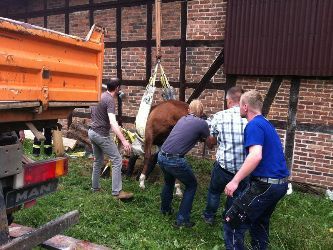 Nach ungefähr einer Stunde war ein Tierarzt aus der Tierklink Kaufungen vor Ort, er narkotisierte das Pferd. Vom städtischen Bauhof wurde ein LKW mit Ladekran zu Hilfe gerufen. Mit einem mühsam angelegten speziellen Geschirr konnte das „schlafende“ Pferd aus seiner Lage befreit und aus der Grube gehoben werden.