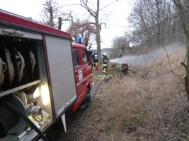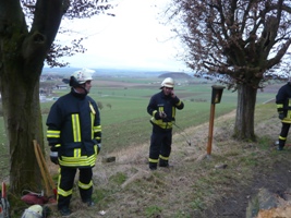 Sicherlich wird sich so manch einer Fragen: Warum dieser Aufwand wegen eines Baumstammes. Antwort: Das Gras an der Waldgrenze ist derzeit hoch und trocken. Schnell hat es Feuer gefangen und es kann zu einem Flächenbrand kommen. Bei den Windverhältnissen an diesem Nachmittag hätte sich der Flächenbrand schnell ausgebreitet.