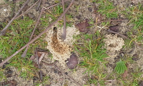 Es handelt sich hierbei um die Weiden-Seidenbiene (Besonderer Artenschutz) sie lebt hier in sehr großen Aggregationen (Anhäufungen). Die Flugzeit ist von Mitte März bis Anfang April (Männchen) bzw. bis Mai (Weibchen). Dann ist erst mal wieder ein Jahr Ruhe. Selbst wenn der Sand im Herbst erneuert wird, würde sich das Nistplatzangebot für diese Bienenart und diesen Standort nicht ändern. Dass die Tiere Sandkästen, Kinderspielplätze mit sandigem Boden o.ä. auslassen ist eher unwahrscheinlich.