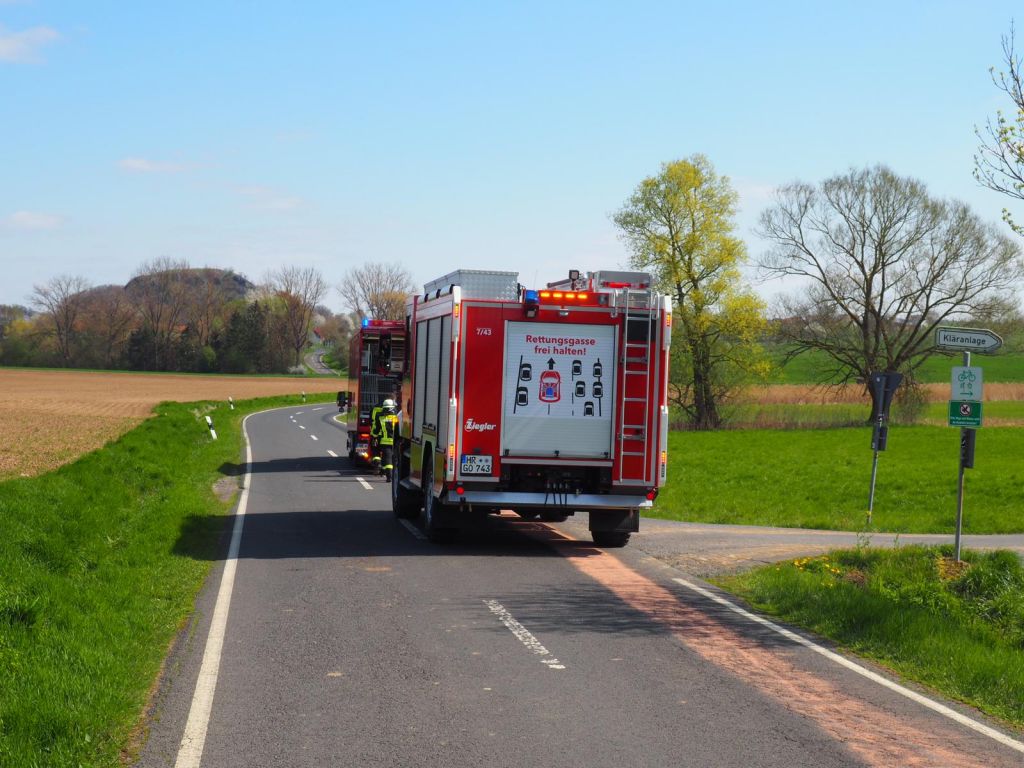Durch den Defekt an einer landwirtschaftlichen Maschine wurde eine Ölspur von ca. 2,5 km Länge vom Friedhof Obervorschütz bis zum Ortseingang Maden verursacht.