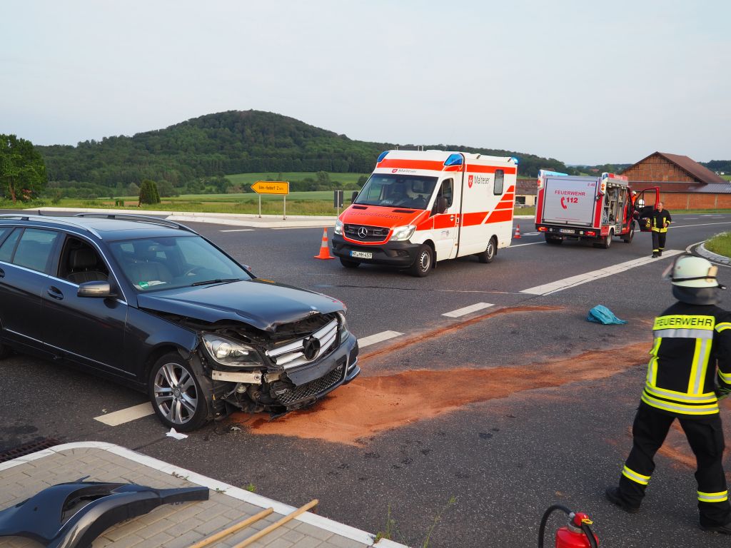 Als er an die naheliegende Kreuzung in der Nähe eines Autohauses kam, übersah eine 23. Jährige Frau welche aus Haldorf kommend die Kreuzung überfahren wollte diesen und überfuhr die Kreuzung geradeaus weiter. Der Pkw des aus Kassel kommenden Fahrer wurde dadurch am Heck getroffen und drehte sich in den Straßengraben. Im Fahrzeug der Jungen Frau befanden sich ihr Freund sowie zwei kleine Kinder, durch den Aufprall wurden die zwei Kinder und der Sohn leicht verletzt und zur weiteren Untersuchung mit zwei Rettungswagen in eine Klinik nach Kassel gebracht. Die Wehr aus Dissen und Deute sicherte die Unfallstelle ab und nahm die Ausgelaufenen Betriebsstoffe auf.