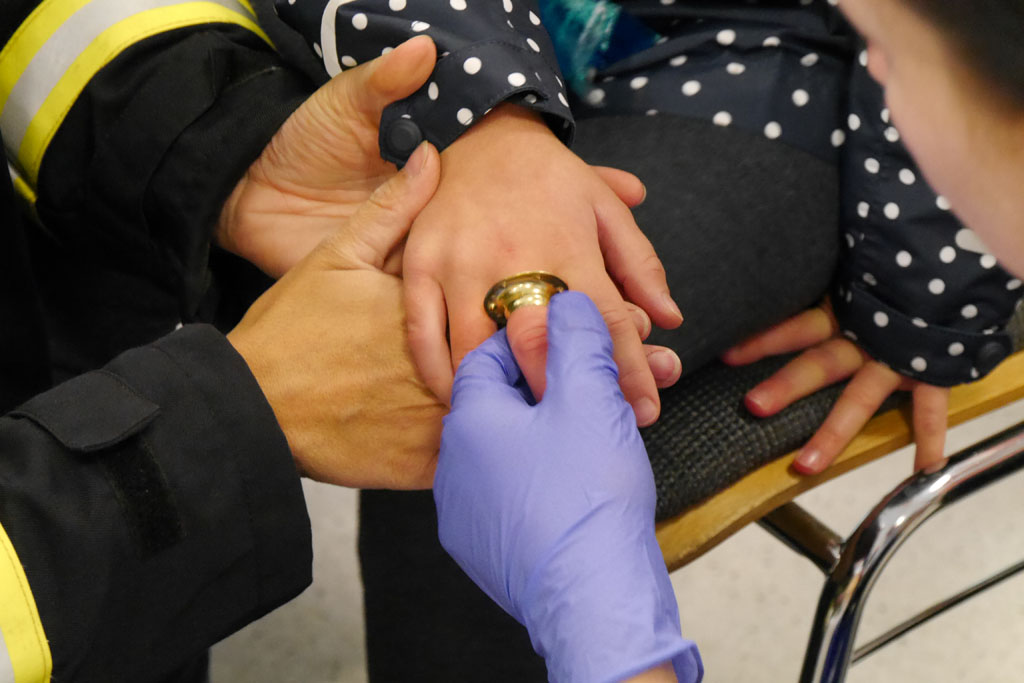 Zuerst wurde versucht, die Öse mit einem Faden und drehen vom Finger zu lösen. Führte jedoch nicht zum gewünschten Erfolg. Mit Hilfe einer speziellen Schere des Rettungsdienstes und weiteren Werkzeugen gelang es dann, die Öse aufzuschneiden und vom Finger zu entfernen.