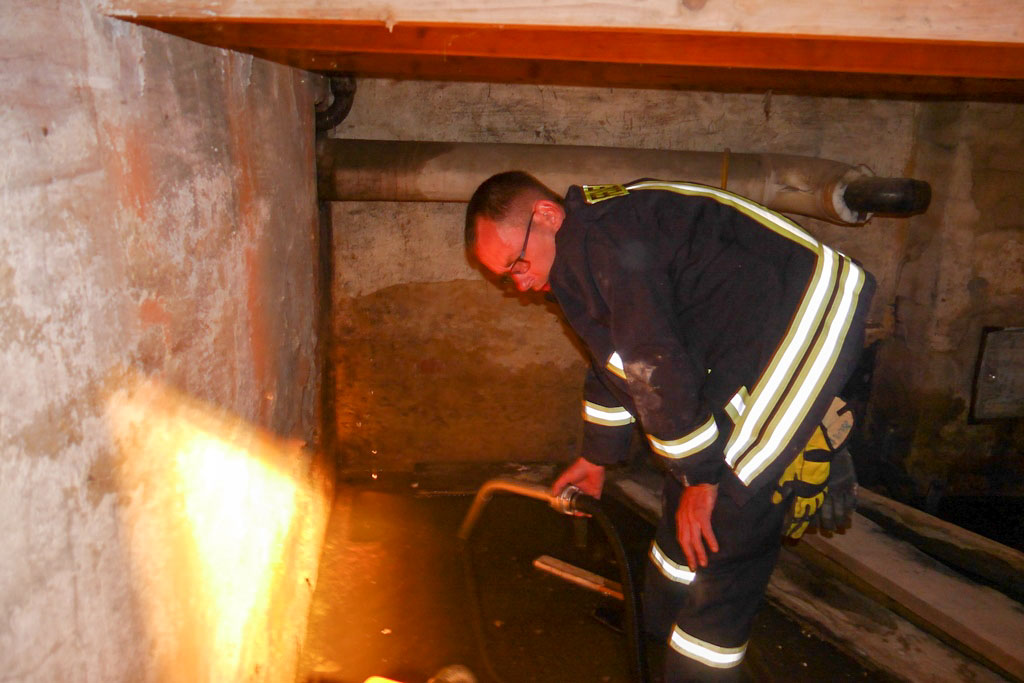 Da gestern Abend keine Gefahr bestand, dass das Wasser größere Schäden an dem Gebäude verursachen könnte, alarmierte er erst heute Morgen die Feuerwehr.