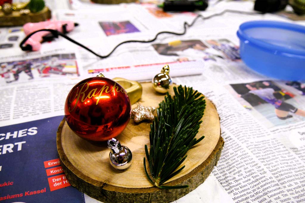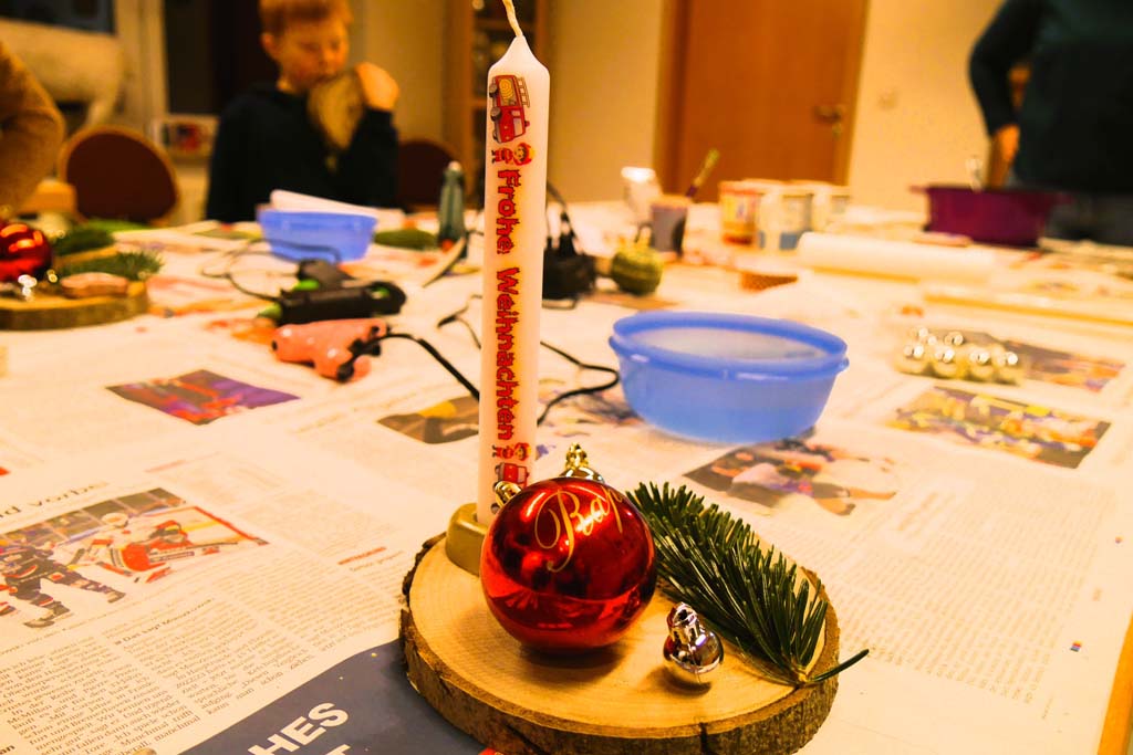 Dabei wurde eine personalisierte Weihnachtskugel mit dem Vornamen des Kindes auf eine Baumscheibe geklebt. In die Mitte kam ein kleiner Kerzenhalter. Den Rest der Baumscheibe konnten die Kinder mit Tanne und kleinen Kugeln, Sternchen und Herzchen verzieren. Für den Kerzenhalter wurde eine Kerze mit Folie im weihnachtlichen Feuerwehr-Design beklebt.