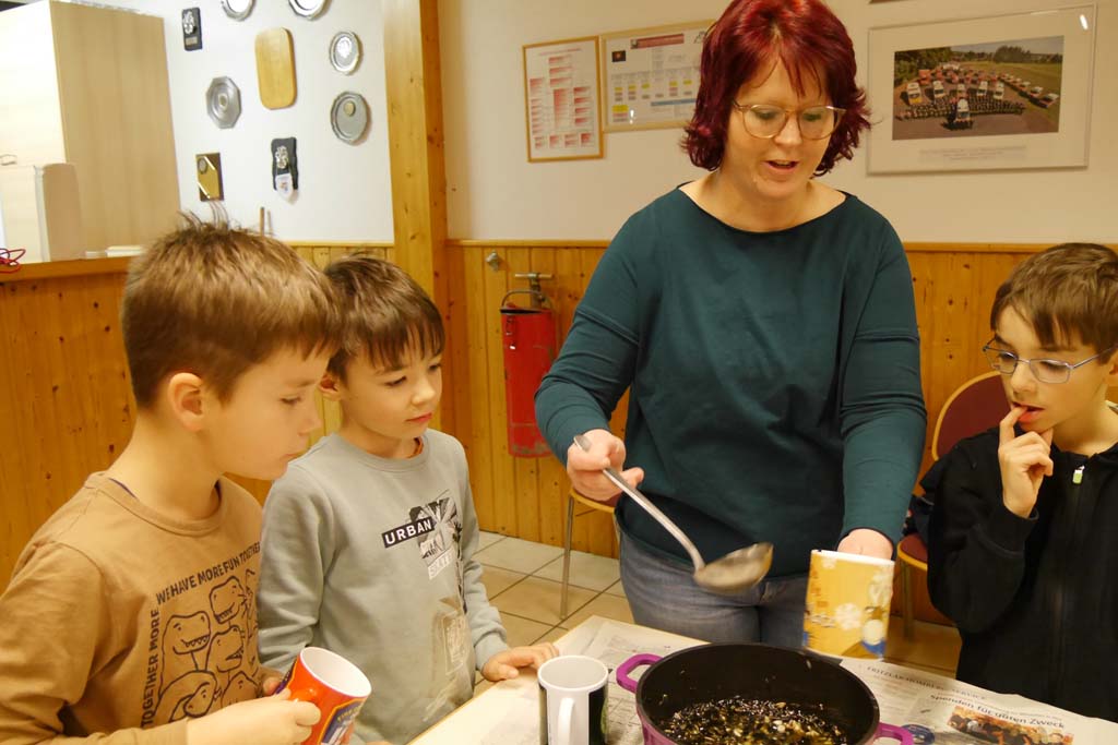 Außerdem fertigte sich jedes Kind eine Vogelfutter-Tasse an. Dabei wurde ein Gemisch aus Kokosfett, Sonnenblumenkernen und gemischten Nussbruch in Porzellantassen gefüllt. Dann wurde ein dünner Stab dort reingesteckt, damit die Vögel sich darauf niederlassen können. Um später die fertigen Tassen draußen aufhängen zu können, wurde der Henkel noch mit einem Band verziert.