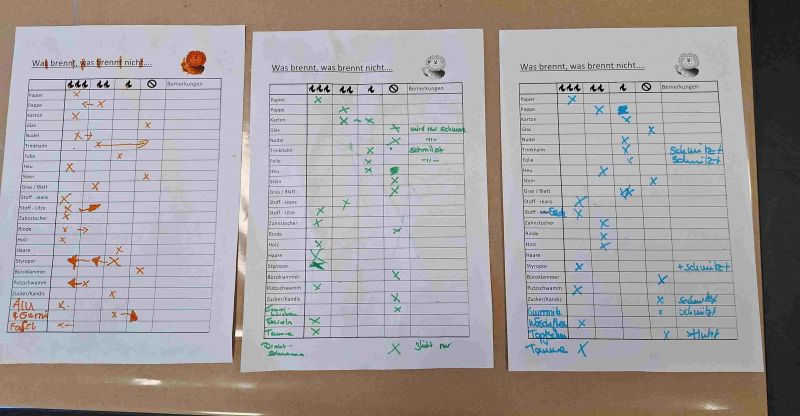 Bevor es dann an die Brennproben ging, bekam jede Gruppe noch eine Liste. Hier sollte im Vorfeld eingetragen werden wie der jeweilige Gegenstand - Stoff - Materlial reagiert.