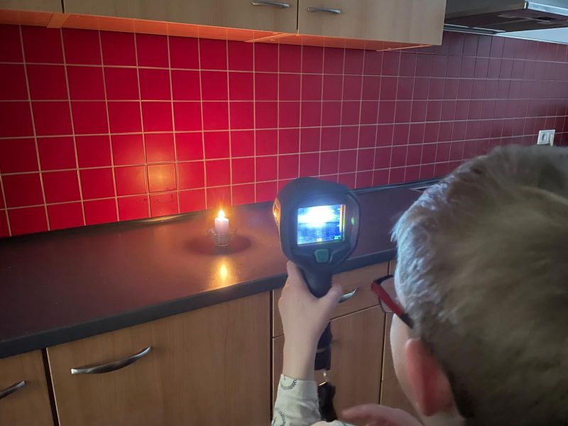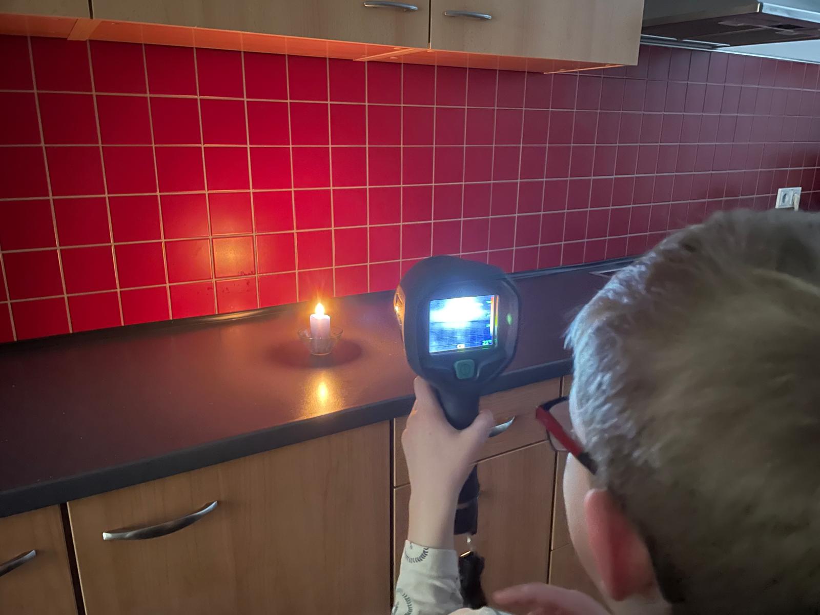 Wasserkocher, Ladekabelstecker, Kerze, Brennpaste und ein Waffeleisen, glühten förmlich vor sich hin… Die Gradzahl wird in der Kamera mit angezeigt und alle staunten, wie heiß diese Gegenstände werden können.