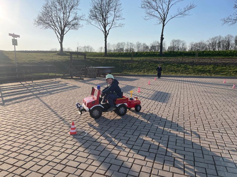 Durch den Parcours um die Pylonen, Löschanhänger ankuppeln und wieder zurück, alles sogar mit einem Helm der Einsatzabteilung.
