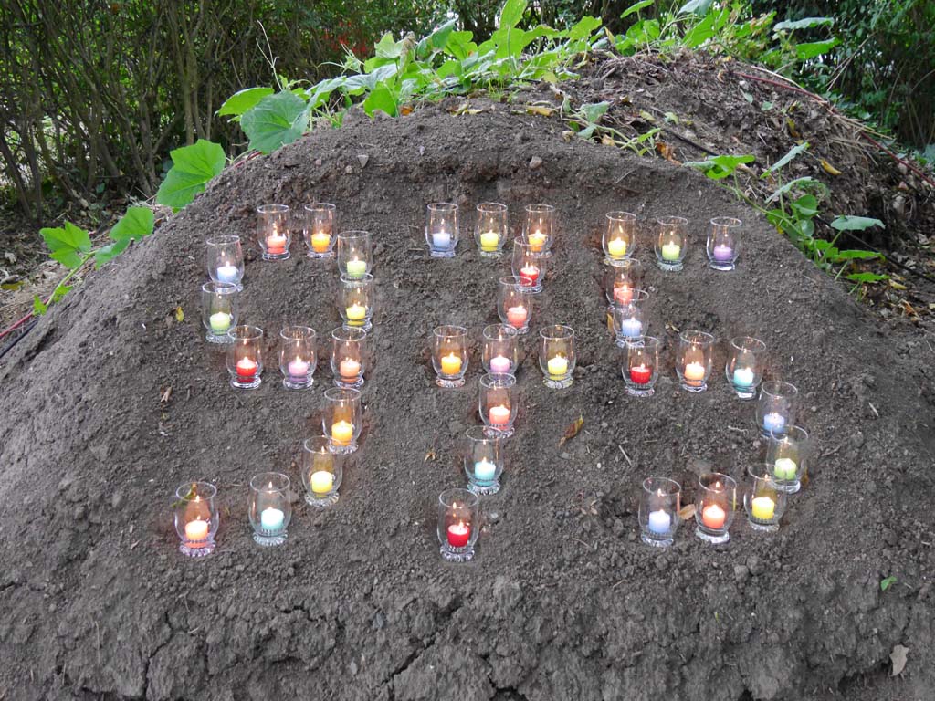 Das besondere Flair bei dieser Veranstaltung machte natürlich der einmalig geschmückte Naturgarten aus. Mit Laternen illuminierte Obstbäume, Teelichter an den Beeteinfassungen, ständige Farbwechsel bei den angestrahlten Bäumen und natürlich die Jahreszahl 975, dargestellt mit bunten Teelichtern, gaben den Besuchern das Gefühl, bei einer Lichtshow live dabei zu sein.