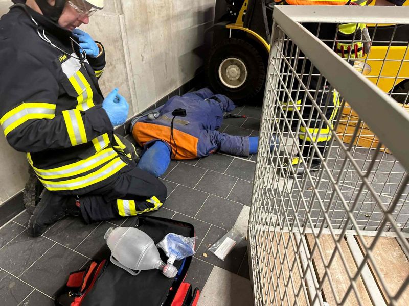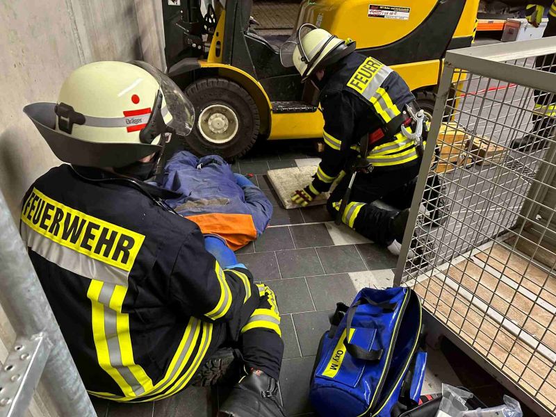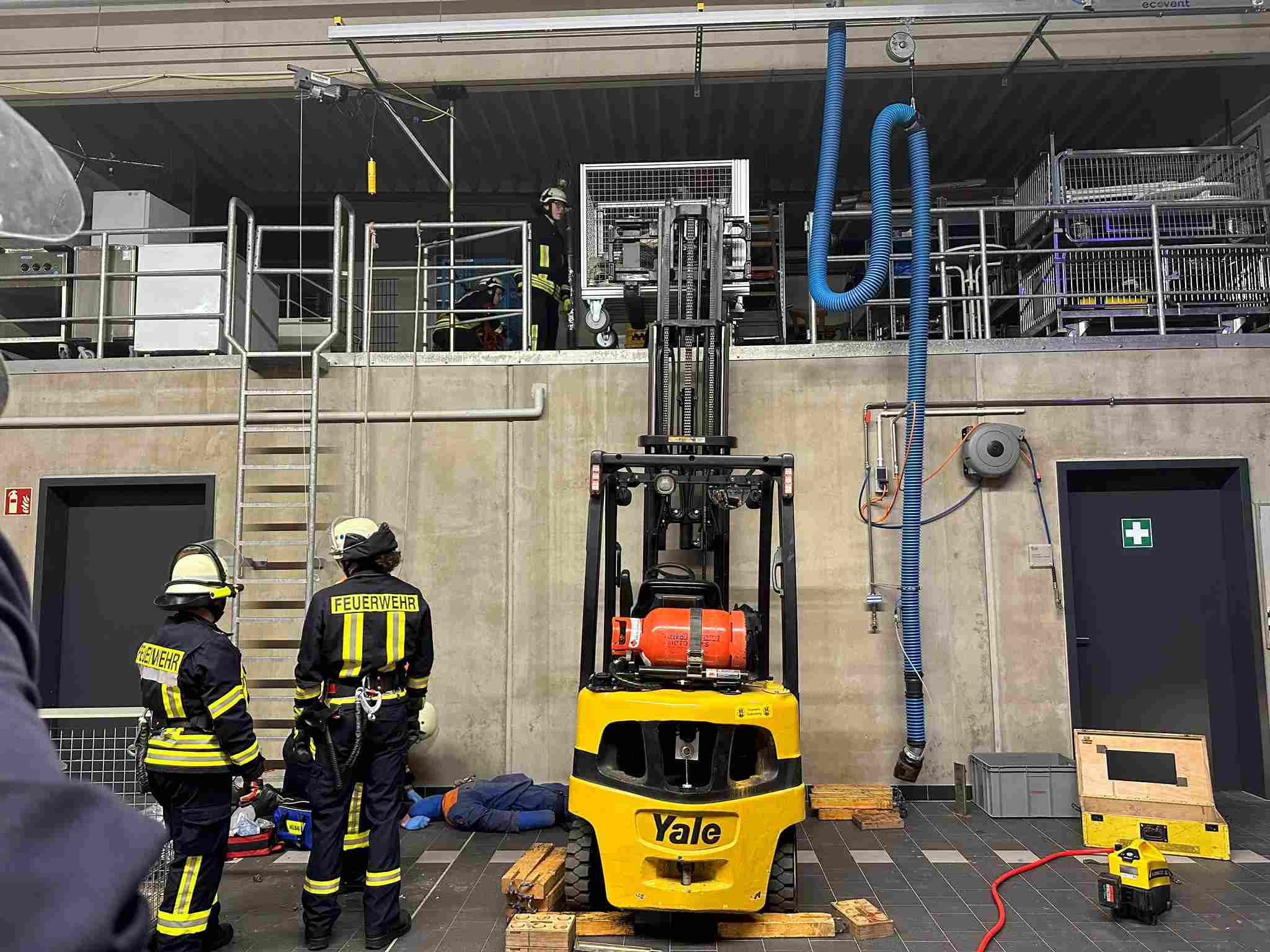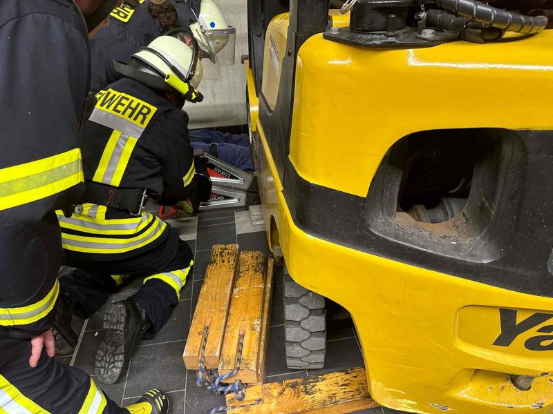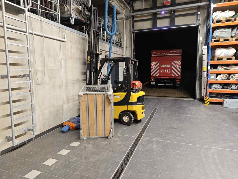 Die Erkundung ergab, dass ein Mitarbeiter beim rangieren von einem Gabelstapler erfasst und unter ihm eingeklemmt wurde.
