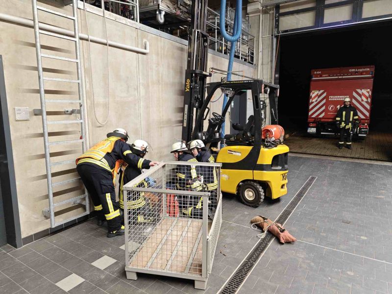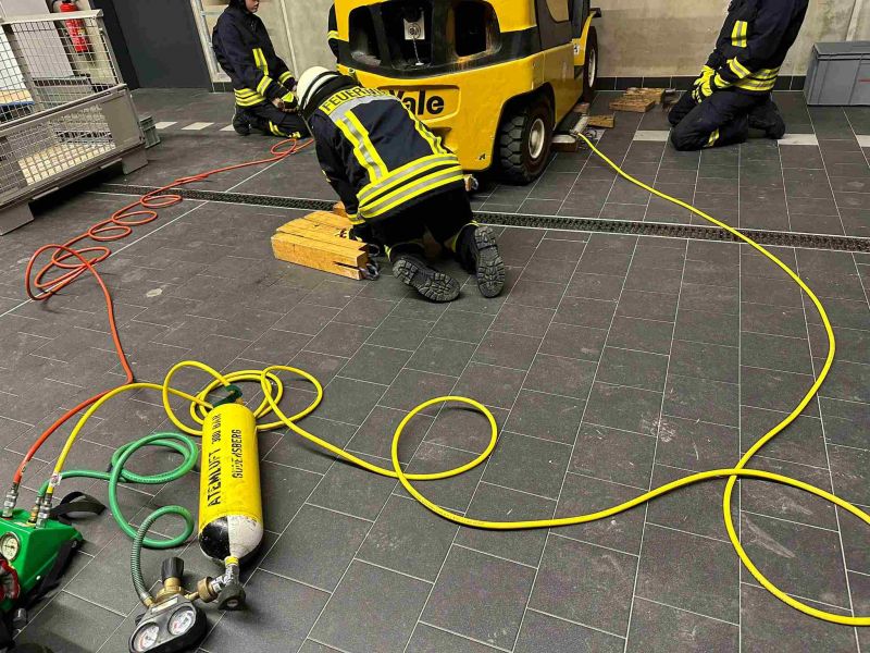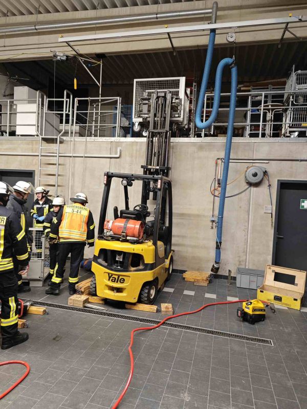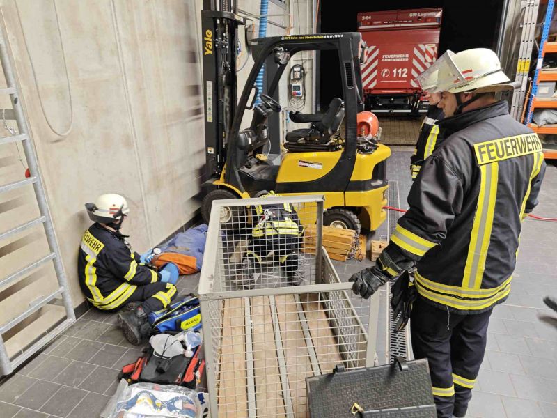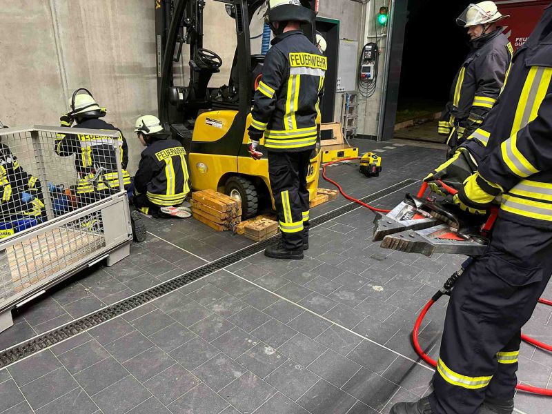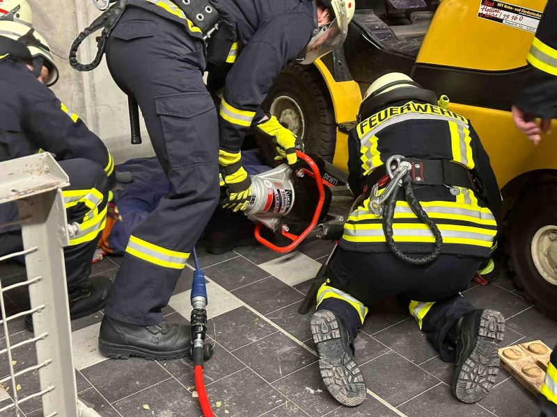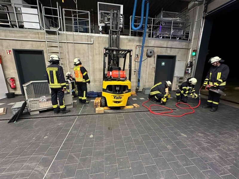 Der Patient wurde sofort medizinisch Erstversorgt und dann mittels Hydraulischen Spreizgerät befreit. Besonderheit: der Gabelstapler war beladen und hatte in ca. 3,5m Höhe seinen Schwerpunkt, ebenso ließ er sich nicht bewegen.