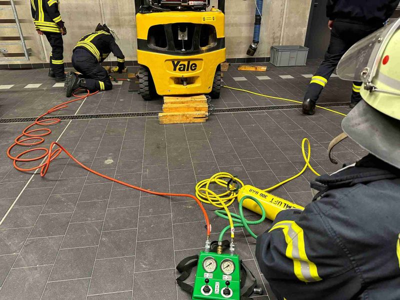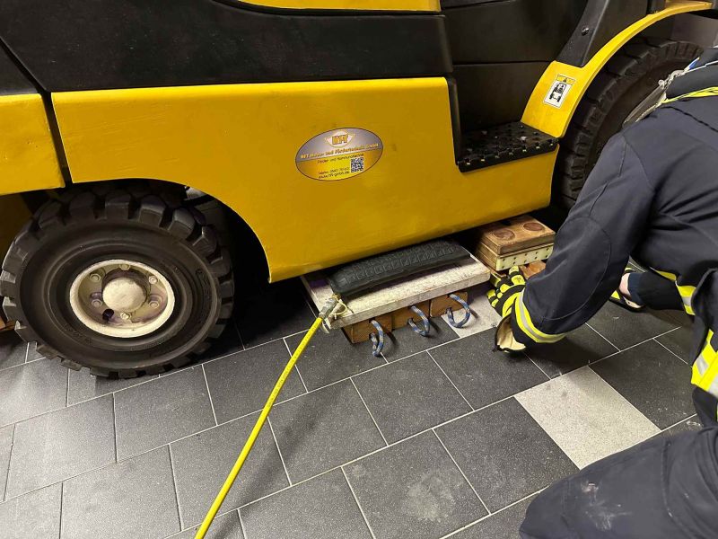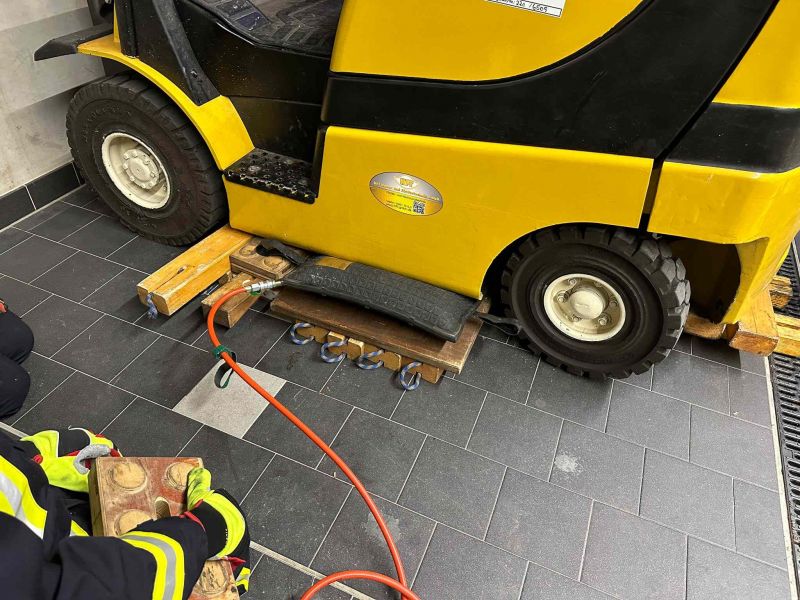 Im Anschluss wurde gemeinsam getestet, ob sich der Stapler mittels Hebekissen ebenfalls anheben lässt.
