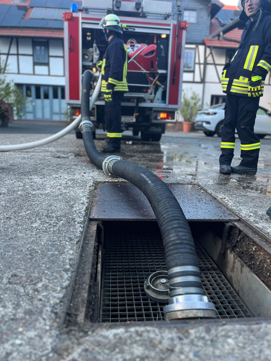 Mit der Tragkraftspritze und Saugschläuchen wurde Wasser aus einer Zisterne entnommen, über einen B-Schlauch gefördert und anschließend über ein C-Rohr abgegeben.