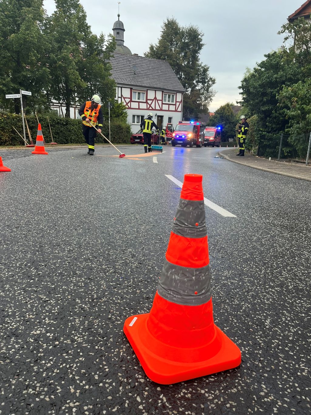 In einer Kurve war auf einer Fläche von rund 10 m² Kraftstoff aufgrund eines umgestürzten Motorrads ausgelaufen. Die Einsatzstelle wurde abgesichert, Ölbindemittel aufgetragen und wieder aufgenommen.