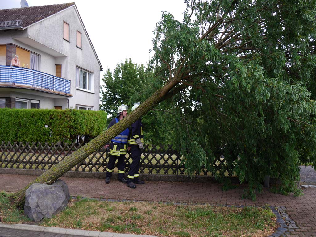 Die Einsatzkräfte der Gudensberger Feuerwehren trafen sich dann im Bereitstellungsraum am Löhner Weg in Gudensberg. Zum Glück waren die Schäden an diesem Abend nicht so gravierend, wie am Sonntagabend in Dorla. Insgesamt sieben Einsatzstellen galt es abzuarbeiten. Umgestürzte Bäume blockierten Die B 254 von der Autobahn Richtung Dissen, genauso die Straße zwischen Gudensberg und Dissen. Weiterhin waren in Dissen selbst noch Bäume entwurzelt oder abgebrochen. In Maden Staute sich der Goldach vor einem Gitter und überflutete die Hauptstraße.