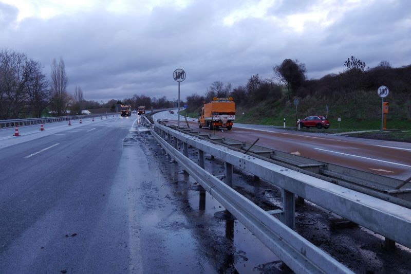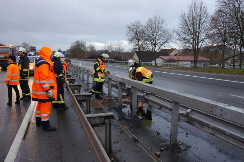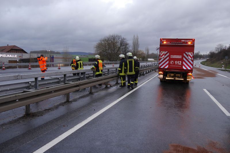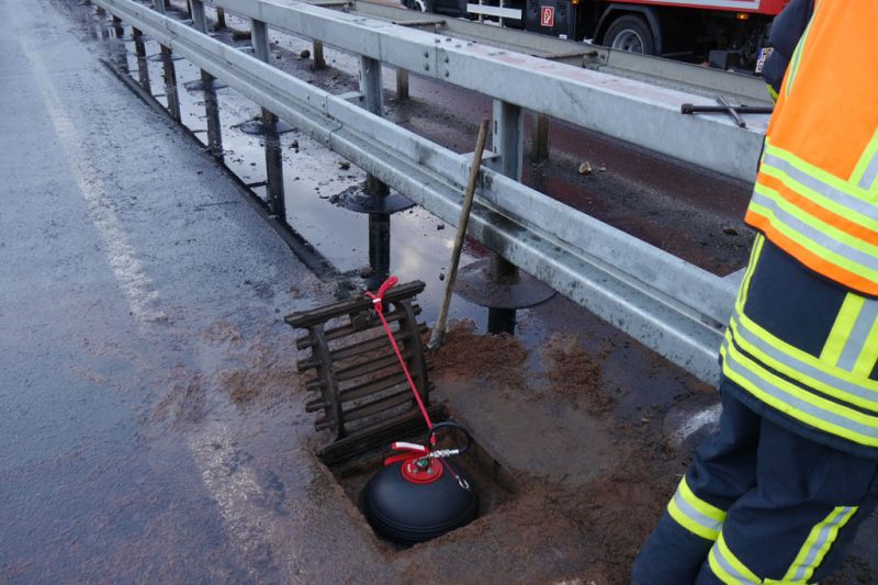 Bei Reinigungsarbeiten durch Straßenmeisterei nach LKW Unfall von heute Nacht, drohte heute Morgen Öl in einen Gulli zu laufen. Feuerwehr dichtete den Gulli ab.