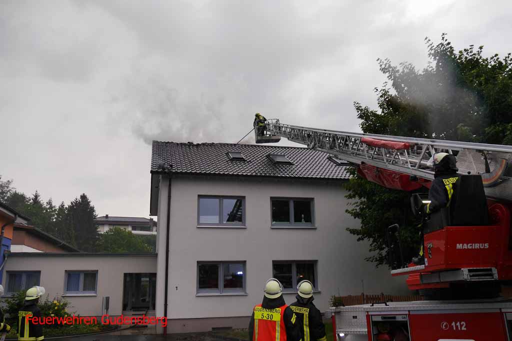 Während eines heftigen Gewitters hatten die Bewohner des Hauses einen lauten Knall vernommen. Bei einem Rundgang im Haus und außerhalb des Hauses konnten sie jedoch keinen Schaden feststellen. Erst Minuten später nahmen sie einen leichten Brandgeruch war. Fast zur gleichen Zeit kamen dann Nachbarn und machten auf die Rauchentwicklung im Dachbereich aufmerksam.