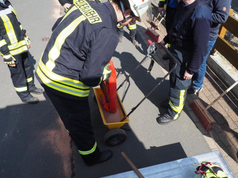 9 Einsatzkräfte der Wehr Obervorschütz, unterstützt durch den Gerätewagen Logistik der Wehr Gudensberg und der Kehrmaschine des städt. Bauhofes, waren immerhin 90 Minuten damit beschäftigt, die Ölspur abzustreuen, das Bindemittel wieder aufzunehmen und dadurch die Fahrbahn abzustumpfen.