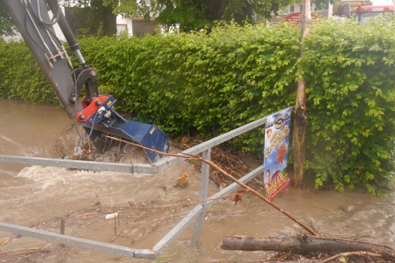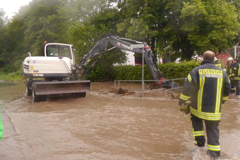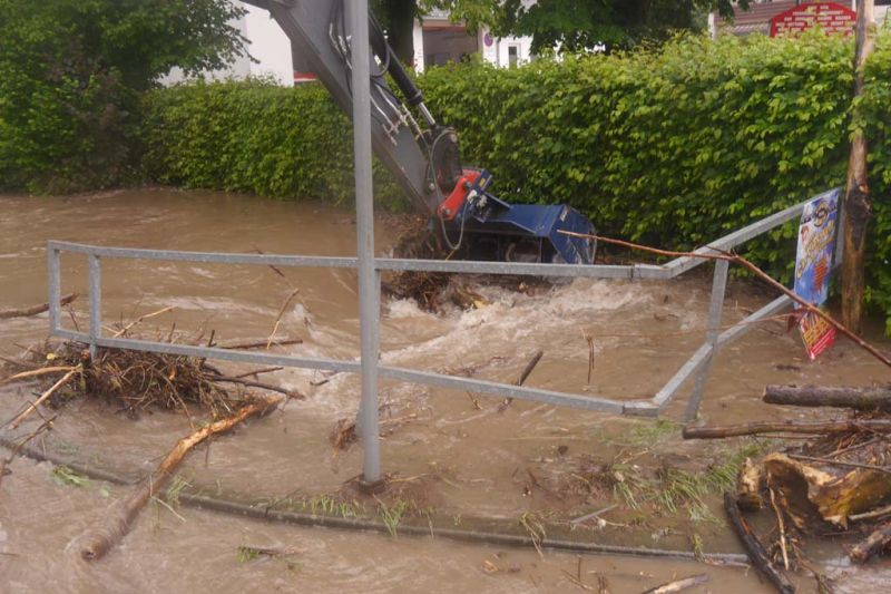 Eine der ersten Maßnahmen der Feuerwehr war, die Straßengullis zu öffnen. Dadurch konnte das Wasser besser in die Kanalisation abfließen. Gleichzeitig wurden Mitarbeiter des Bauhofes alarmiert, die dann mit Hilfe eines Baggers den Einlauf des Goldbaches in die unterirdische Verrohrung von Geäst und ähnlichen Dingen freiräumten. Dadurch konnte das Wasser dann sehr schnell abfließen und die Gefahr der weiteren Überschwemmung war gebannt.