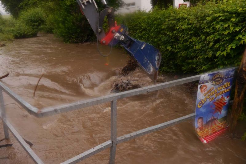 Gegen 17:20 Uhr kam dann die Meldung, dass der Goldbach in Maden über die Ufer getreten ist und die Hauptstraße überschwemmte. Hier kam die Feuerwehr Maden zum Einsatz, unterstütz von der Feuerwehr Obervorschütz.