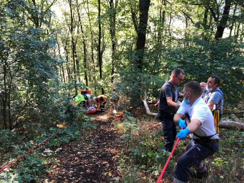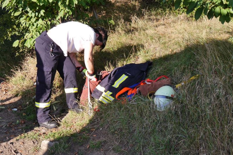Nach der Erstversorgung konnte die Verletzte dann mit Hilfe der Schleifkorbtrage, Leinen und Muskelkraft den Steilhang bis zum nächsten Weg hinaufgezogen werden.