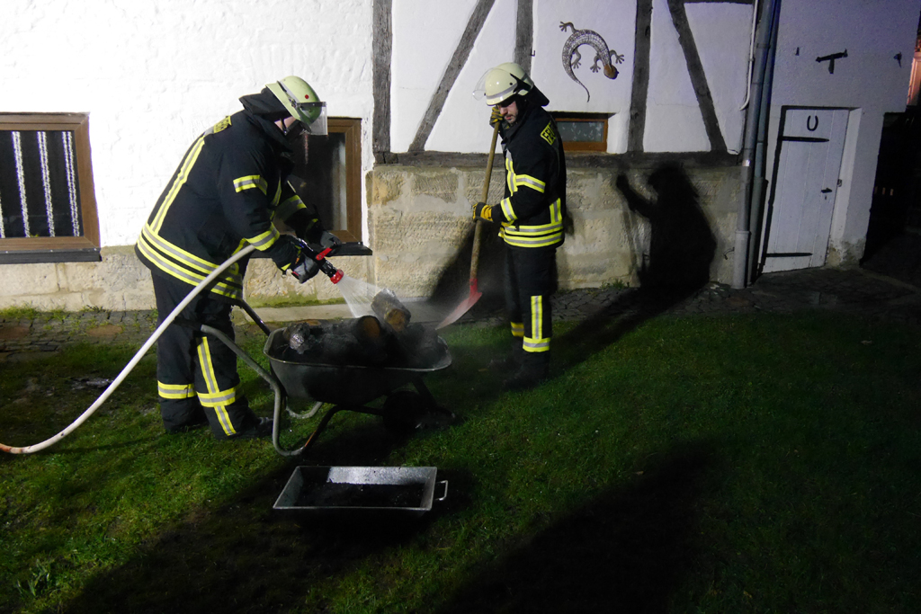 Zum Glück nahm eine Nachbarin Brandgeruch wahr und sah von einem Fenster aus, dass auf dem angrenzenden Grundstück Rauch aufstieg und Funkenflug zu sehen war. Sie alarmierte über den Notruf die Feuerwehr.