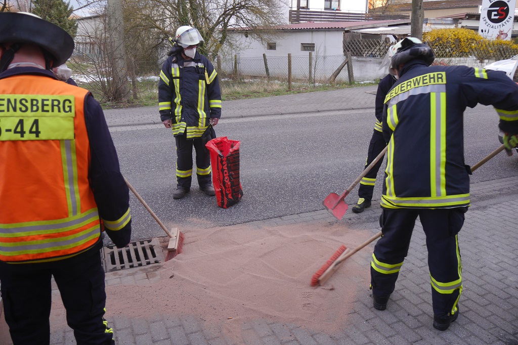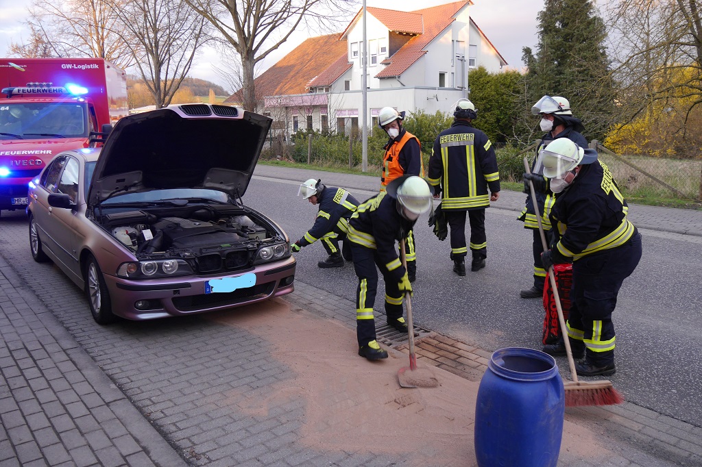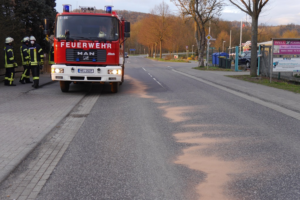 Ein PKW Fahrer aus Kassel bemerkte auf der Besser Str., kurz vor dem Ortseingang von Gudensberg, Dieselgeruch im Fahrgastraum. Er hielt daraufhin auf dem Parkstreifen an und stellte fest, dass Dieselkraftstoff aus einer defekten Leitung austrat und alarmierte die Feuerwehr.