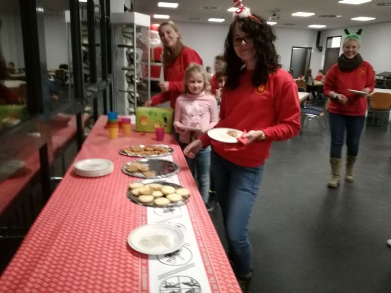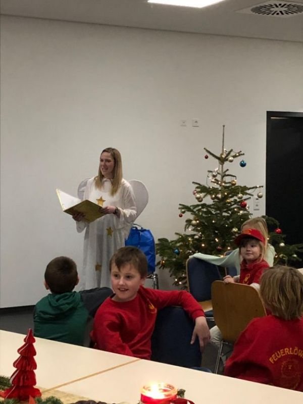 Irgendwann als nochmal das Lied " In der Wiehnachtsbäckerei..." angestimmt wurde klopfte es zaghaft an der Tür und ein Engelchen kam zu uns herein. Der Weihnachtsengel, geschickt vom Weihnachtsmann, der es leider aus Zeitmangel und zu viel Arbeit dieses Jahr nicht persönlich zu uns geschafft hat. Allerdings hatte ihm der Weihnachtsmann sein Goldenes Buch mitgegeben, in dem all seine Notitzen über alle Kinder stehen. So konnte der Engel persönlich zu jedem Feuerlöwen berichten und manche bekamen ein paar Tipps wie z.B. besser zuhören, nicht so viel Quatsch machen,...