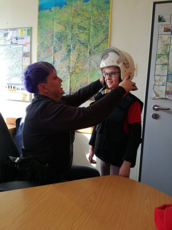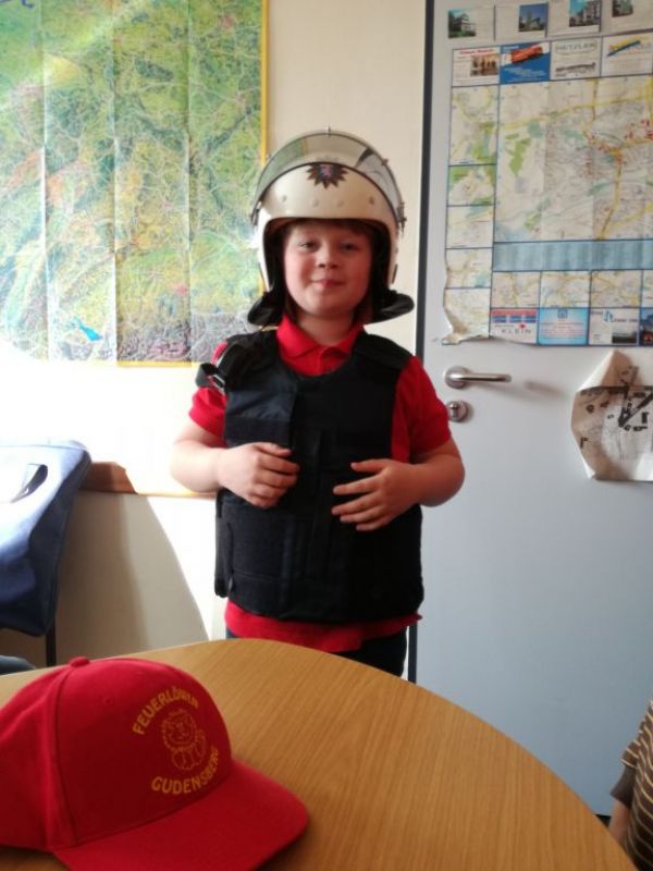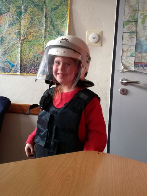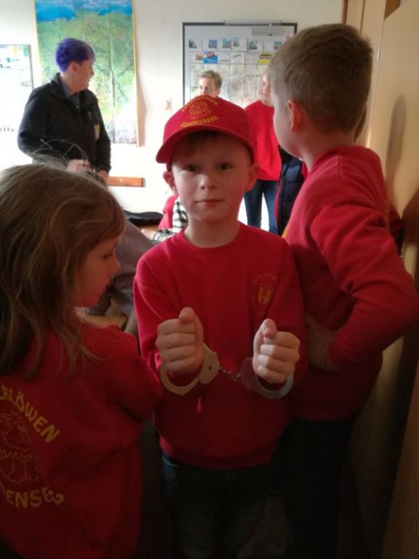 Die Dienstkleidung mit Sicherheitsausrüstung wurde begutachtet, alles was die Polizeibeamten an ihrem "Gürtel" tragen. Die Waffe, Schlagstock, Handschuhe, Taschenlampe,...und die Handschellen. Diese durften gleich von allen einmal Probe getragen werden, ebenso die Schutzweste und der Polizeihelm so konnte sich jeder Feuerlöwe mal wie ein Bereitschaftspolizist fühlen. ( ganz schön schwer, diese Kugelsichere Weste )
