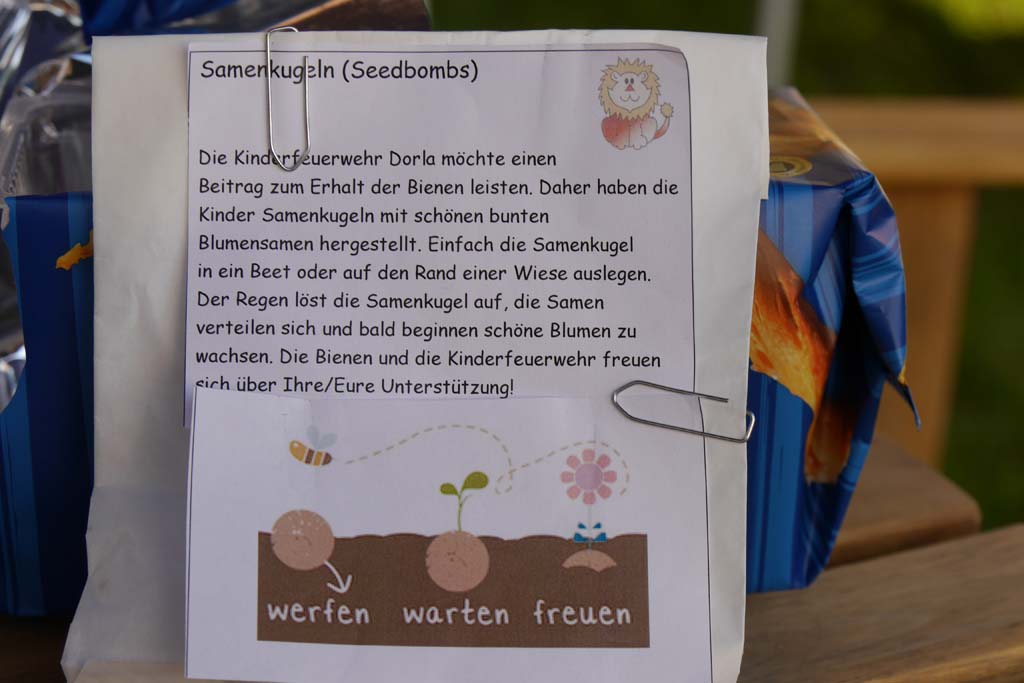 Eigentlich war geplant, dass die Feuerlöwen diese Kugeln verpacken, mit einer Anleitung versehen und an die Haushalte in Dorla verteilen. Leider hat uns die Corona-Krise ausge-bremst und das Projekt konnte, aufgrund der Vorgaben für die Feuerwehren, nicht gemeinsam beendet werden. Damit aber die ganze Mühe nicht umsonst war, wurden die Betreuer aktiv. Getrennt von einander wurden die Tüten verpackt und fast pünktlich zum Frühlingsanfang Ende März in die Dorlarer Briefkästen verteilt. Natürlich erhielt auch jeder Feuerlöwe eine Samenkugel.