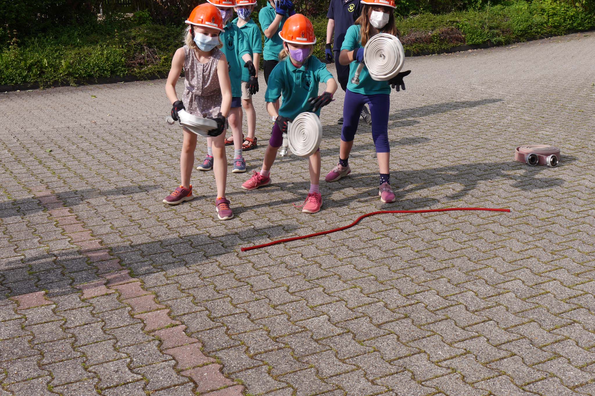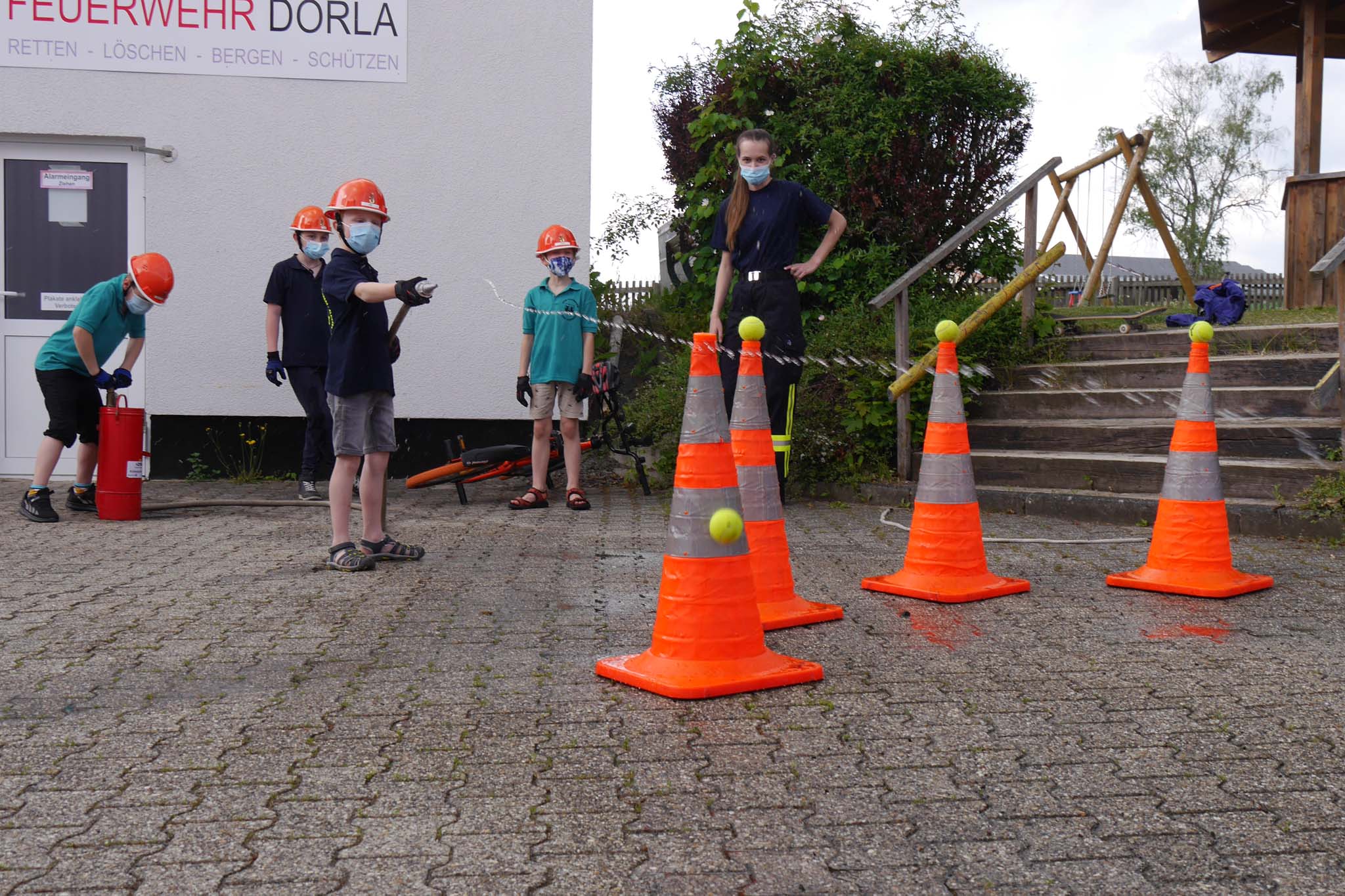 Danach konnten die Kids ihr Können beim Zielspritzen mit der Kübelspritze unter Beweis stellen. Ein riesiger Spaß, vor allem bei dem sonnigen Wetter. An einer anderen Station wurde das richtige „Schlauchausrollen“ geübt. Schon nach wenigen Versuchen hatten alle den Dreh heraus und schafften es, denn Schlauch durch unser Knotengerüst zu rollen.