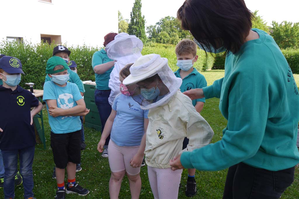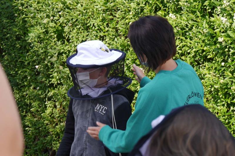 Ausgestattet mit Imkeranzug näherte sich die erste Gruppe dem Bienenstock. Alle waren erstaunt, wie viele Bienen sich dort tummeln und wie fleißig sie die Waben füllen, sogar den Honig konnten wir erkennen. Die ganz Mutigen trauten sich sogar die Waben in die Hand zu nehmen.