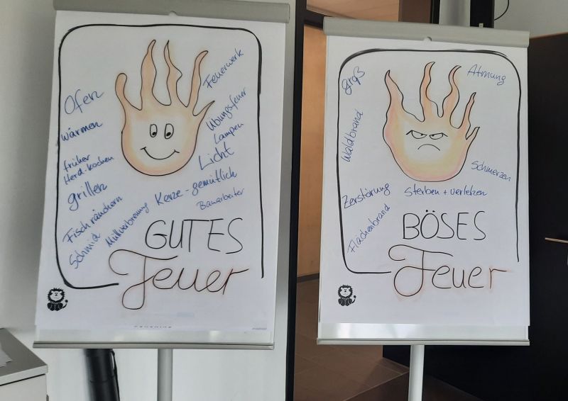 Wir überlegten, besprachen, sammelten viele Begriffe und Ideen die wir jeweils dem guten oder bösen Feuer zuordneten.