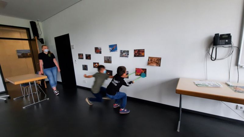 Fliegenklatschen dienten als Feuerpatschen nach Ansage sollten die Kinder genau das richtig Bild finden und das Feuer "aus klatschen" selbstverständlich wurde zur "Brandbekämpfung“ zu zweit im Trupp vorgegangen.
