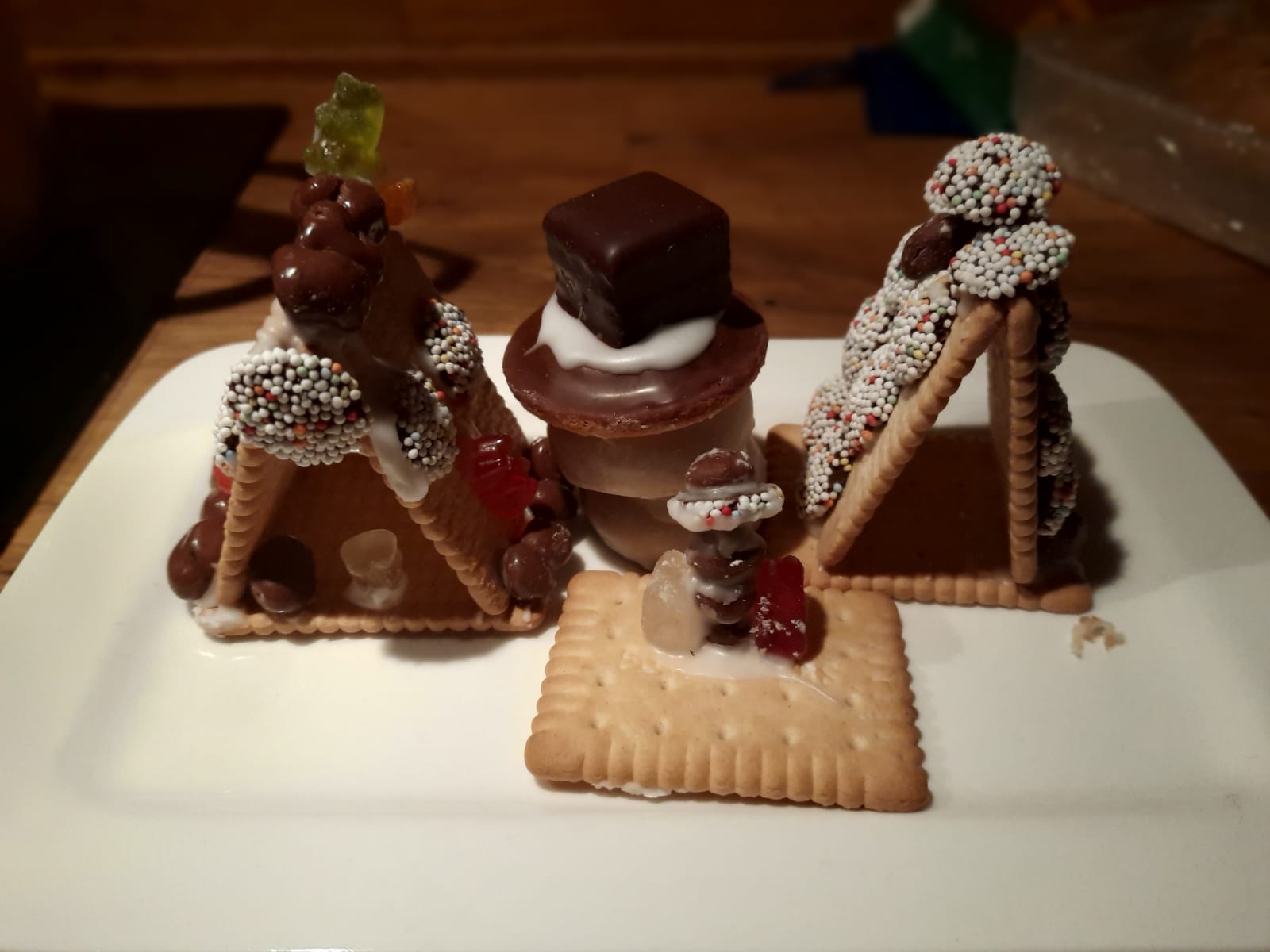 Es entstanden z.B. viele kleine, bunte, leckere Miniatur Knusperhäuschen aus Butterkeksen und Schneemänner mit Dominosteinhut,…
