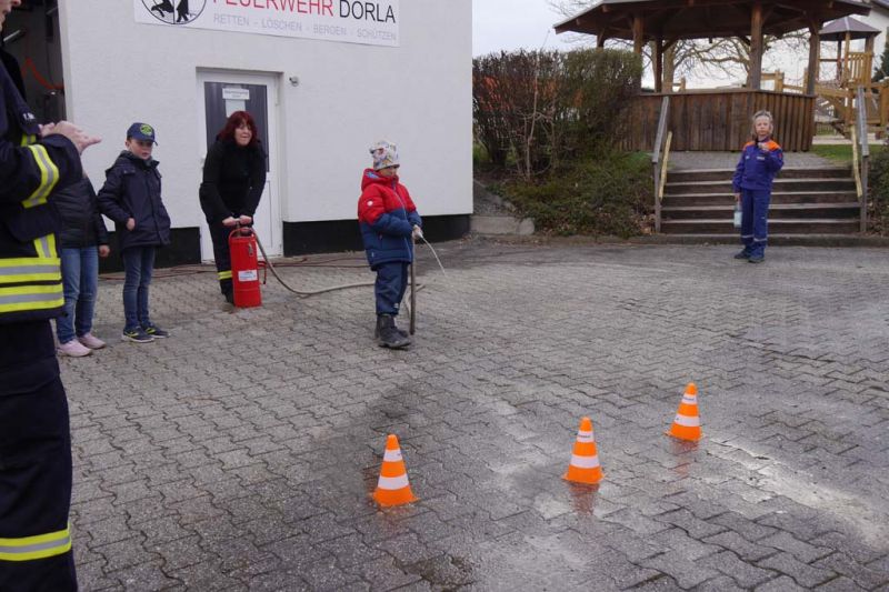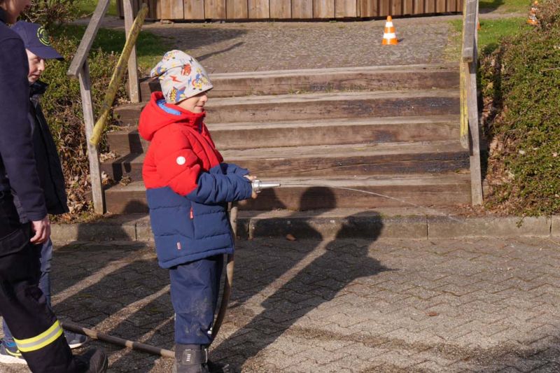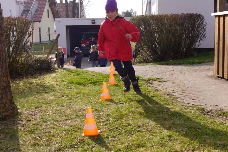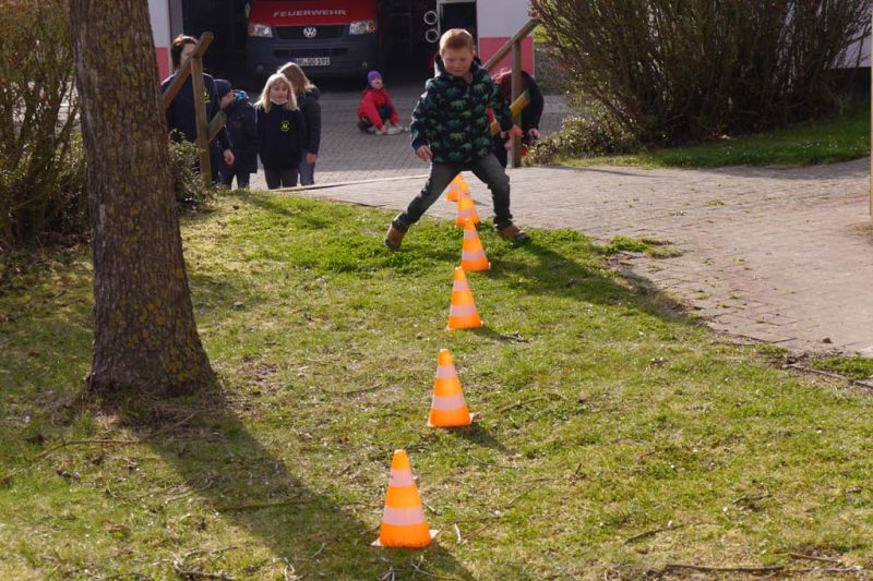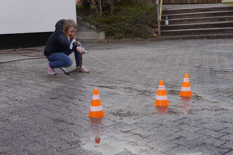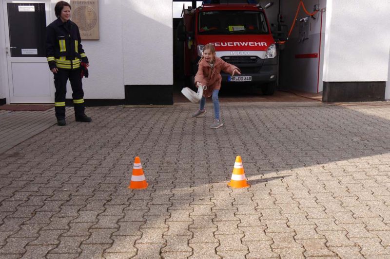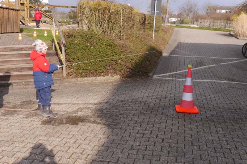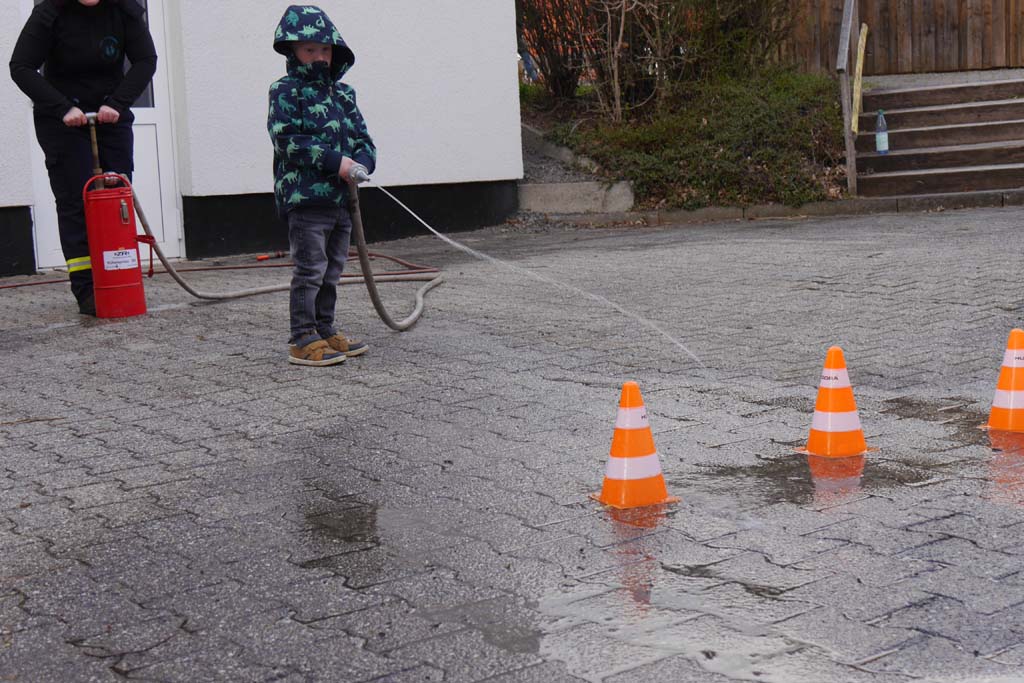 Am meisten Begeisterung bringt natürlich immer das Element Wasser, sodass nach zwei Parcours-Durchgängen jeder noch mehrmals drei Hütchen mit Hilfe der Kübelspritze über eine Ziellinie befördern durfte. Wer wollte durfte auch selbst die Kübelspritze bedienen.