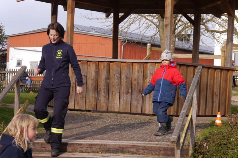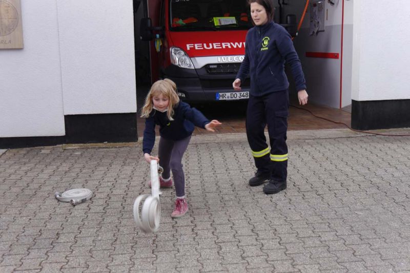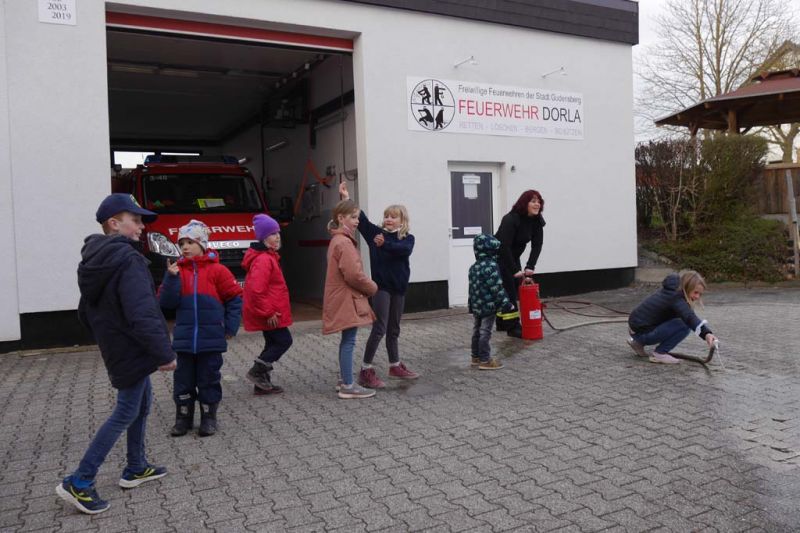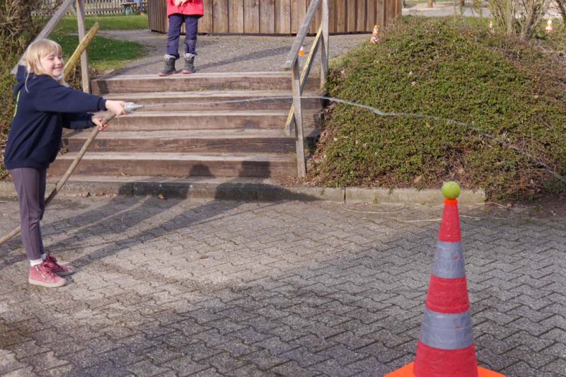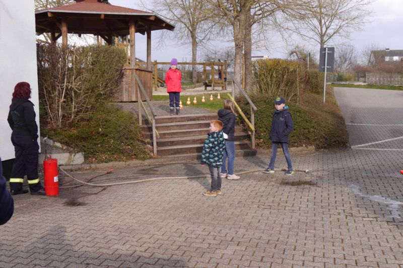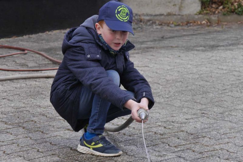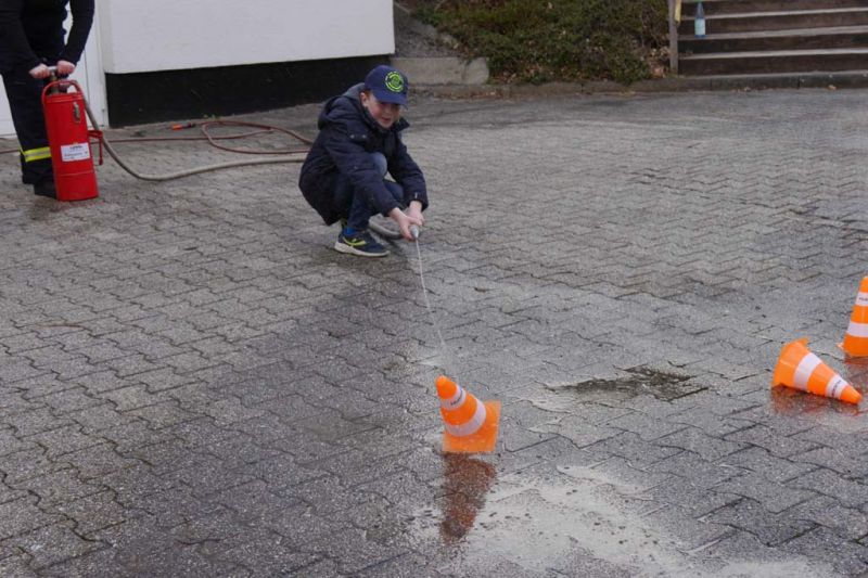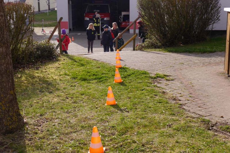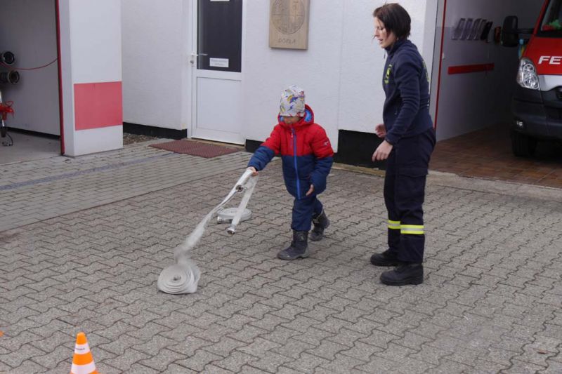 Am meisten Begeisterung bringt natürlich immer das Element Wasser, sodass nach zwei Parcours-Durchgängen jeder noch mehrmals drei Hütchen mit Hilfe der Kübelspritze über eine Ziellinie befördern durfte. Wer wollte durfte auch selbst die Kübelspritze bedienen.