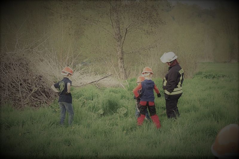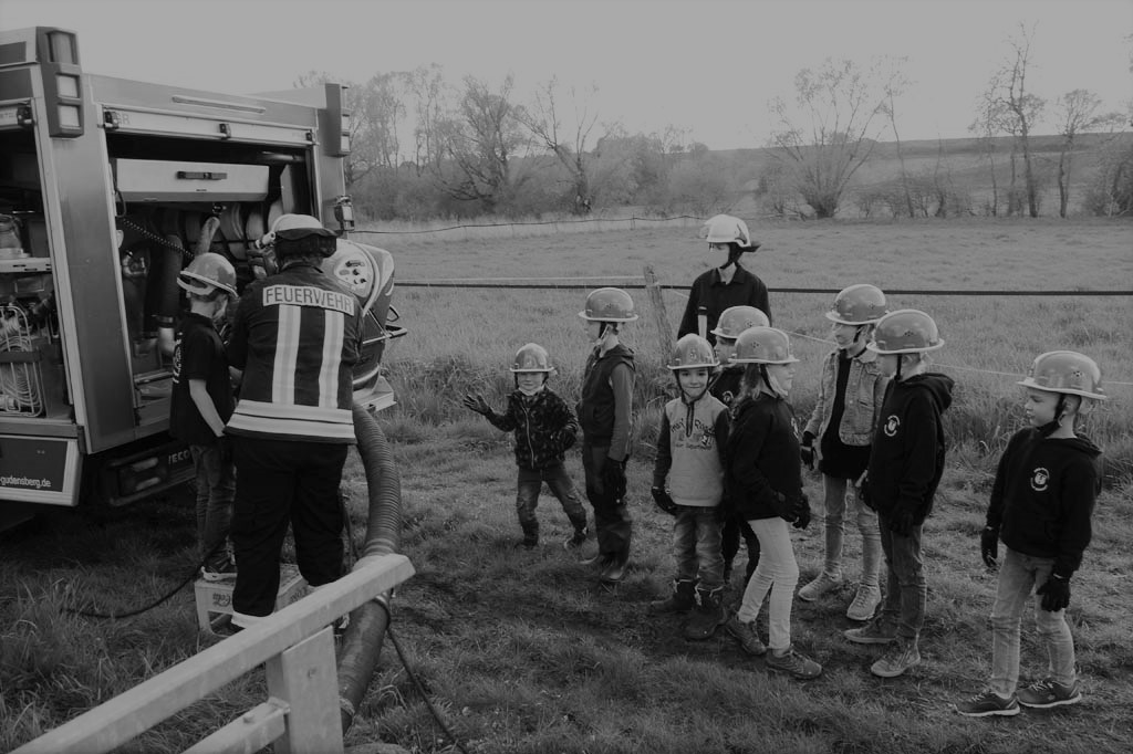Am Übungsort angekommen wurde zunächst besprochen, welches Material für die Entnahme aus einem offenen Gewässer benötigt wird. Jedes Kind hatte hier Ideen und ganz konkrete Vorstellungen und so lagen ruckzuck Saugschläuche, Kupplungsschlüssel, Saugkorb mit Sieb und zwei Leinen parat.