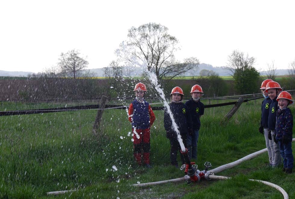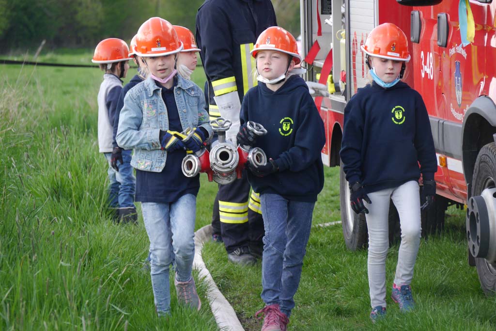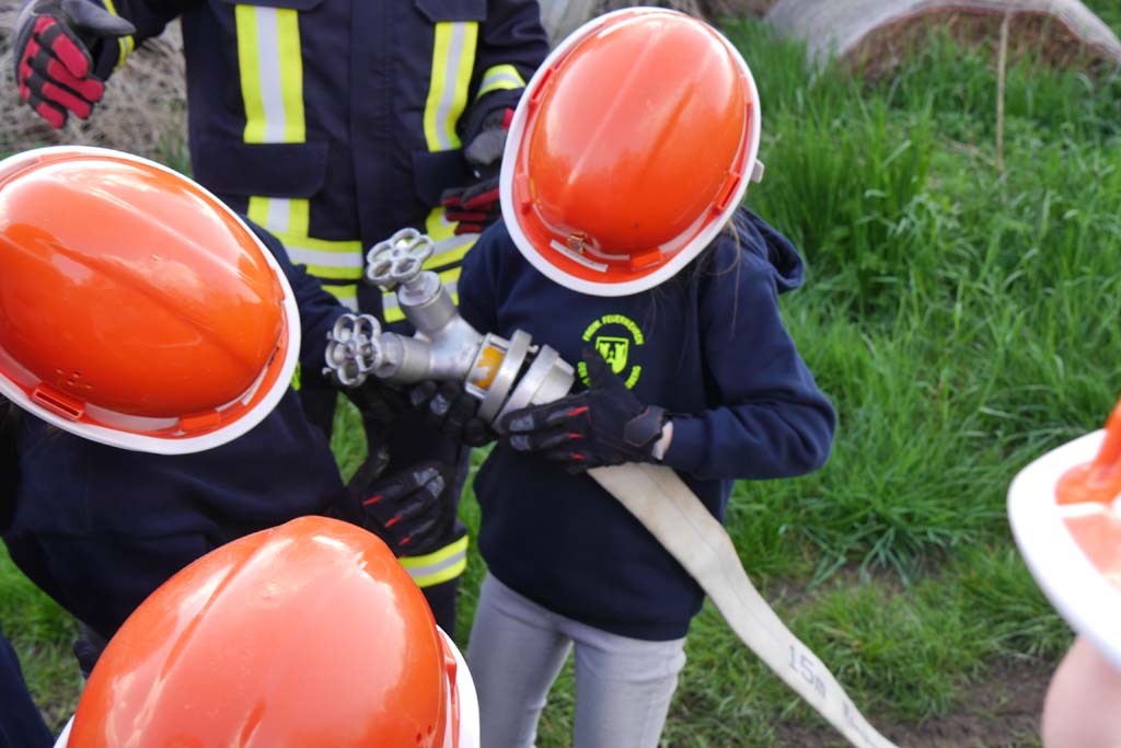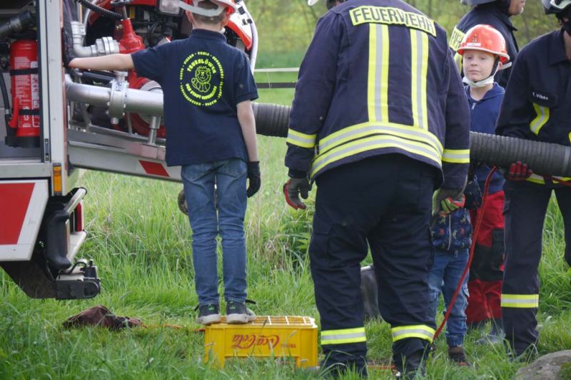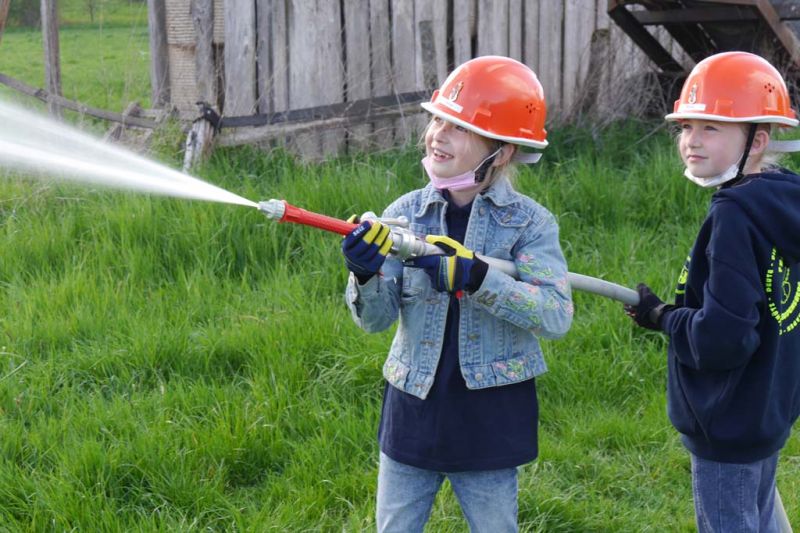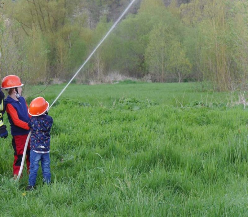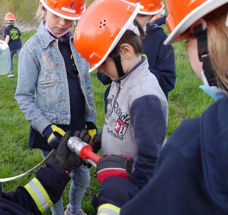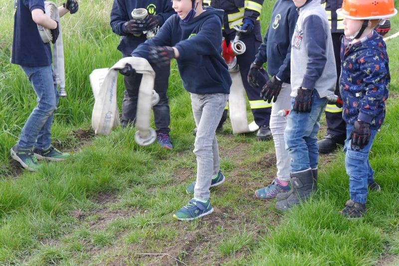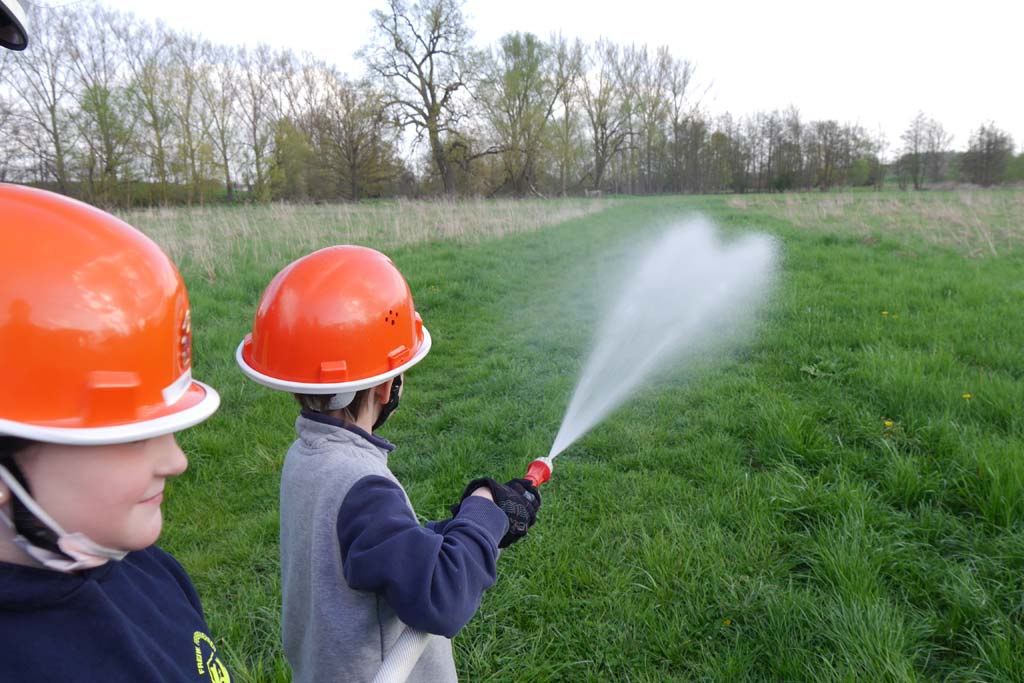 Da die Kinderfeuerwehr nur mit D-Schläuchen arbeiten sollte, wurde vom „großen“ Verteiler noch eine Versorgung zu unserem „kleinen“ D-Verteiler aufgebaut. Von dort wurden dann zwei D-Rohre vorgenommen. Jeder Feuerlöwe durfte natürlich mal das Strahlrohr bedienen und spritzen sowie den Verteiler bedienen. Die gesamte Leitung wurde gemeinsam mit den Kids aufgebaut. Erstaunlich war hier, wie gut sie sich schon auskennen. Das Aufbauen einer Wasserversorgung, egal ob vom Hydranten oder aus offenem Gewässer, ist für sie kein Problem.