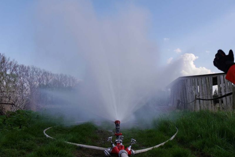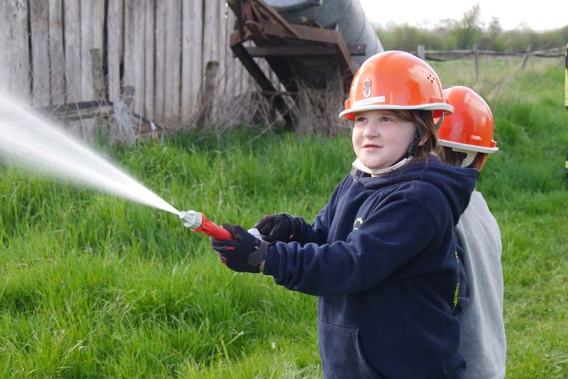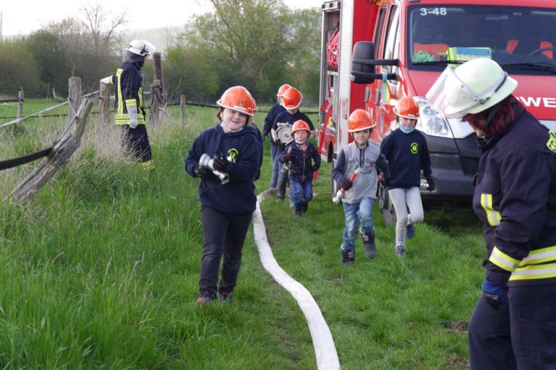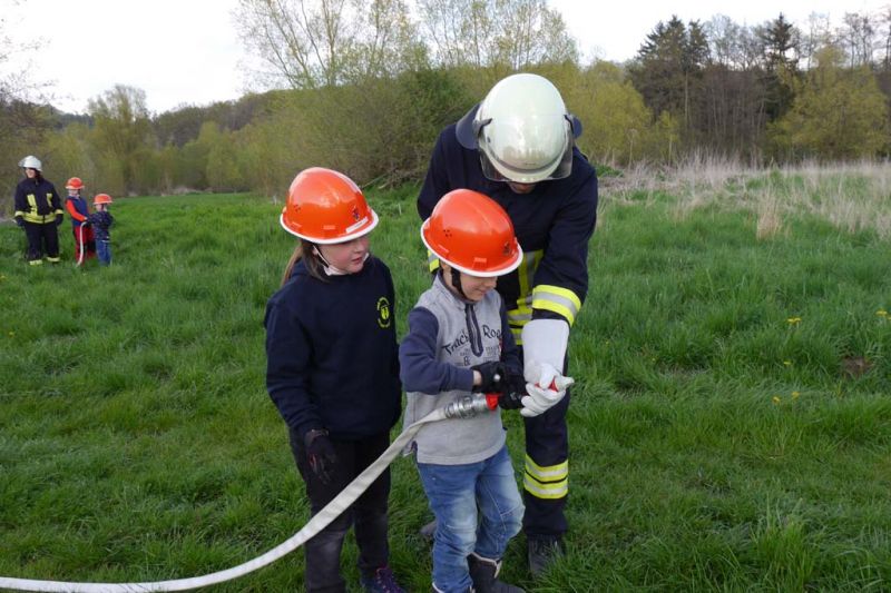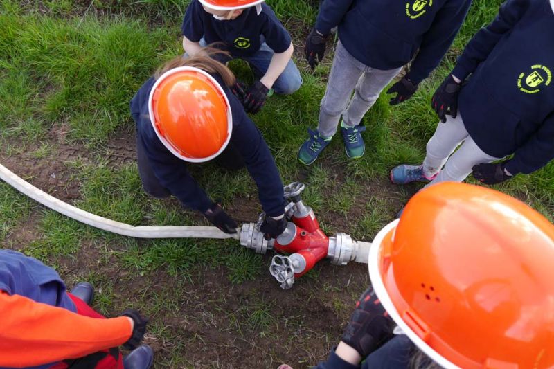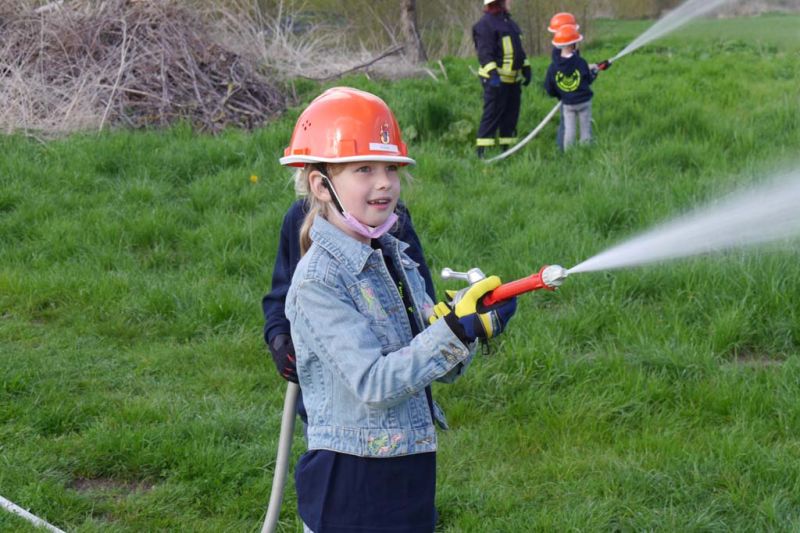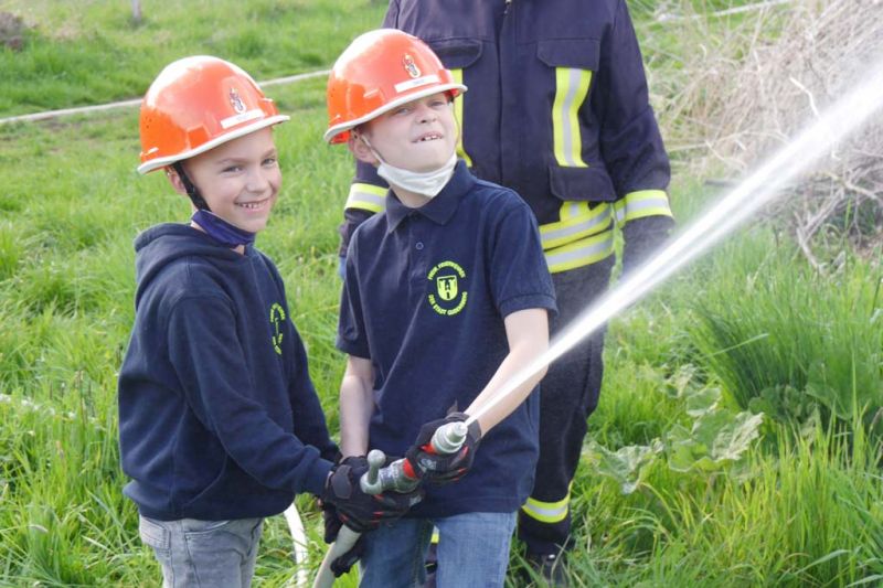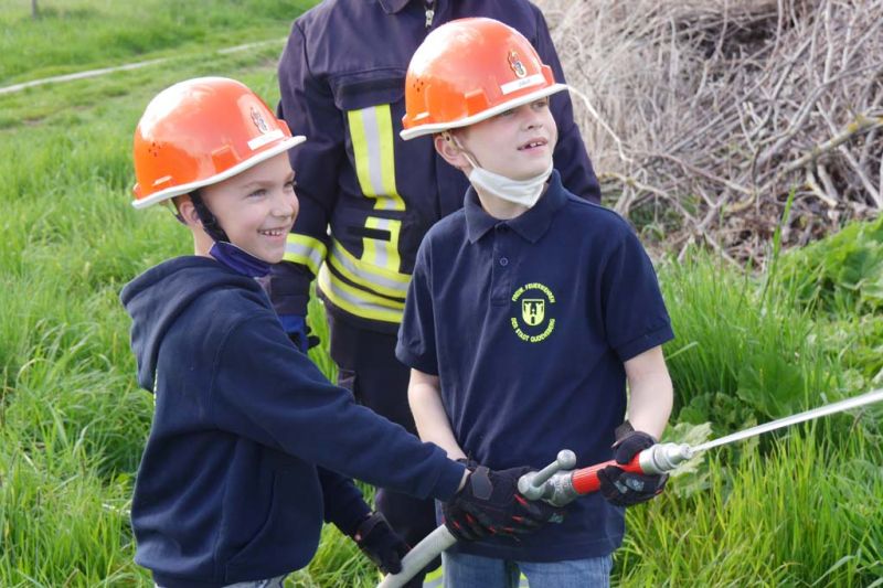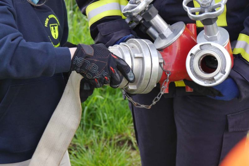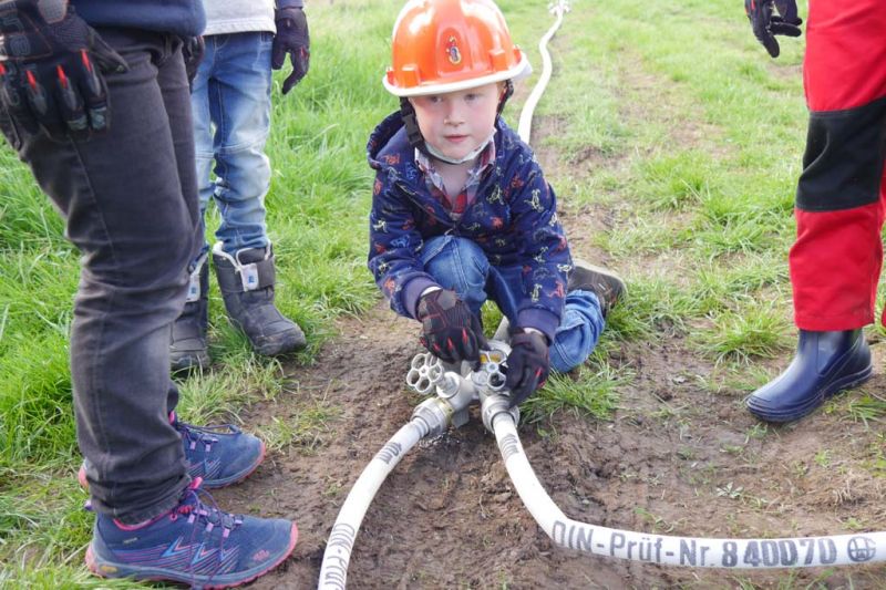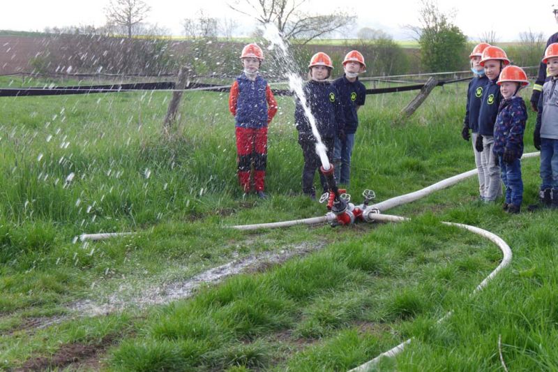 Da die Kinderfeuerwehr nur mit D-Schläuchen arbeiten sollte, wurde vom „großen“ Verteiler noch eine Versorgung zu unserem „kleinen“ D-Verteiler aufgebaut. Von dort wurden dann zwei D-Rohre vorgenommen. Jeder Feuerlöwe durfte natürlich mal das Strahlrohr bedienen und spritzen sowie den Verteiler bedienen. Die gesamte Leitung wurde gemeinsam mit den Kids aufgebaut. Erstaunlich war hier, wie gut sie sich schon auskennen. Das Aufbauen einer Wasserversorgung, egal ob vom Hydranten oder aus offenem Gewässer, ist für sie kein Problem.