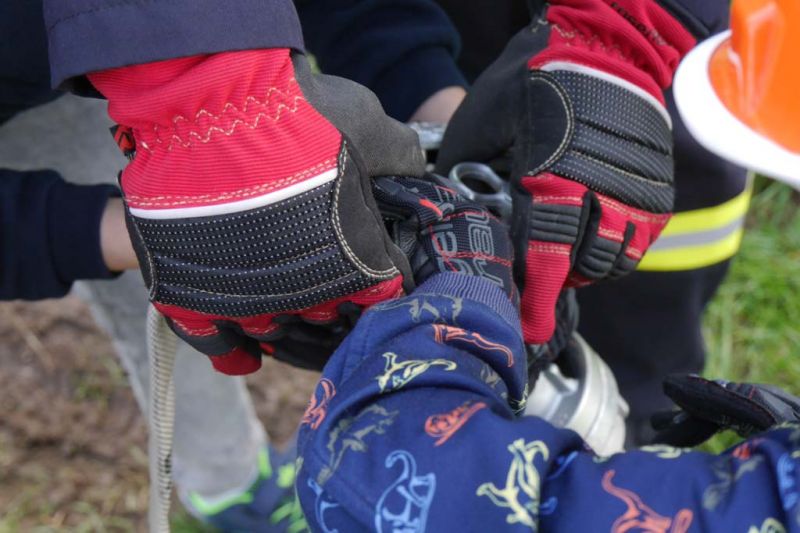 Bevor es richtig los ging, wurden alle Kinder mit Helm und Handschuhen ausgestattet. Dann gab es auch schon das erste Highlight – die Fahrt im Feuerwehrauto zu unserem Übungsort.