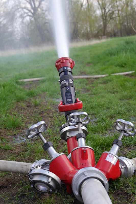 Mit Hilfe von Lars, unserem Wehrführer und Tobias Fricke wurde die Saugleitung aufgebaut, diese an die Pumpe angekuppelt und dann ins Wasser gelassen. Natürlich wollten wir nicht nur Wasser entnehmen, sondern auch Wasser über Strahlrohe abgegeben. Auch hier wurde zunächst besprochen, was benötigt wird und das entsprechende Material vom Auto genommen. Über einen B-Schlauch wurde die Wasserversorgung zum Verteiler aufgebaut.