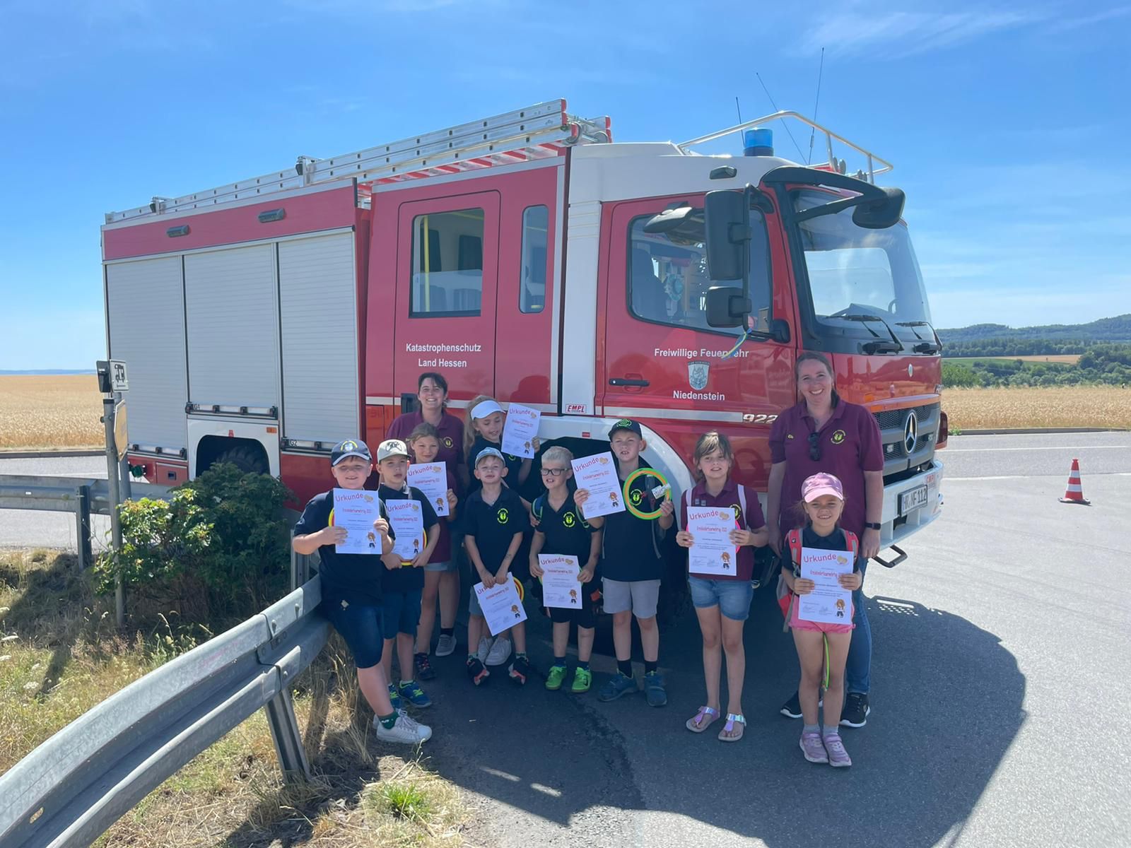 Nach der Siegerehrung, durchgeführt von den Kreiskinderfeuerwehrwartinnen, dem Bürgermeister von Niedenstein und dem stv. Kreisbrandinspektor konnten alle Feuerlöwen sehr glücklich mit ihrer Uhrkunde und einer coolen Frisbee die Heimreise antreten.